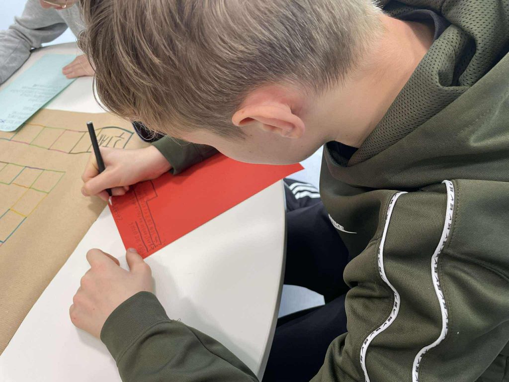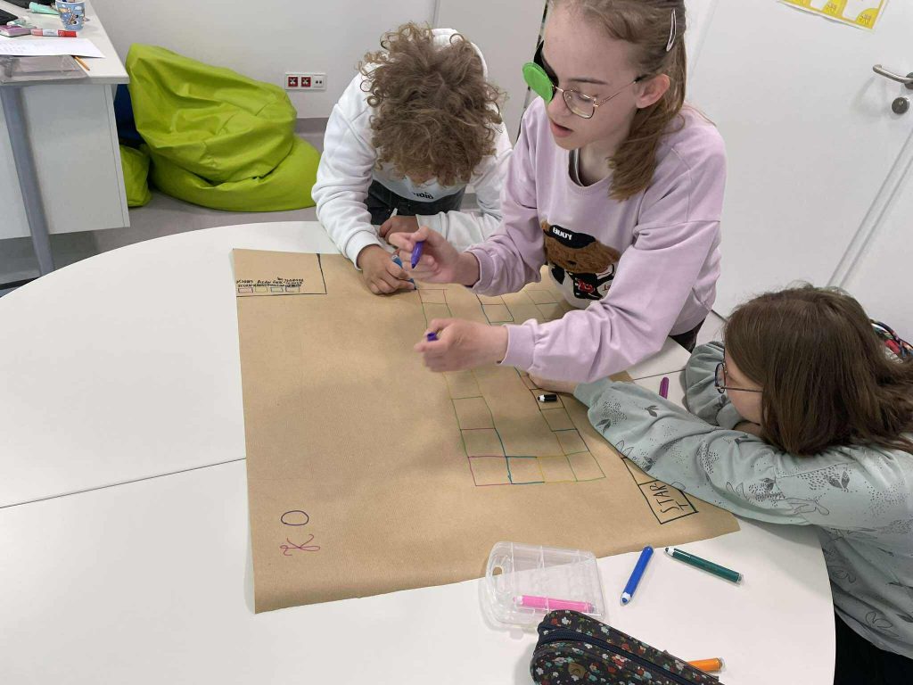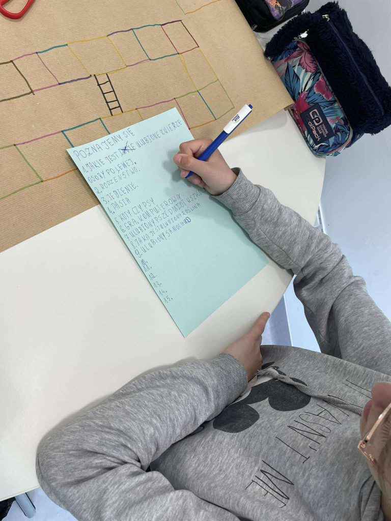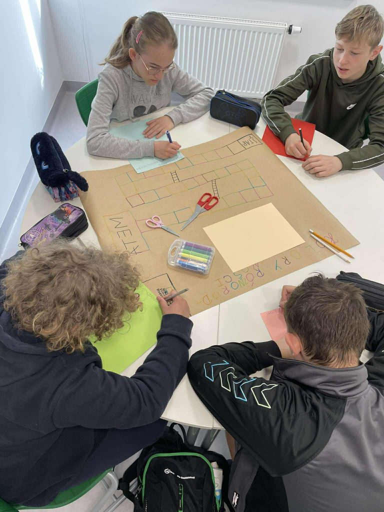 Uczniowie wspólnie zaprojektowali planszę, stworzyli pytania i kategorie kart, a następnie gra została przeniesiona do wersji cyfrowej przez nauczyciela.
