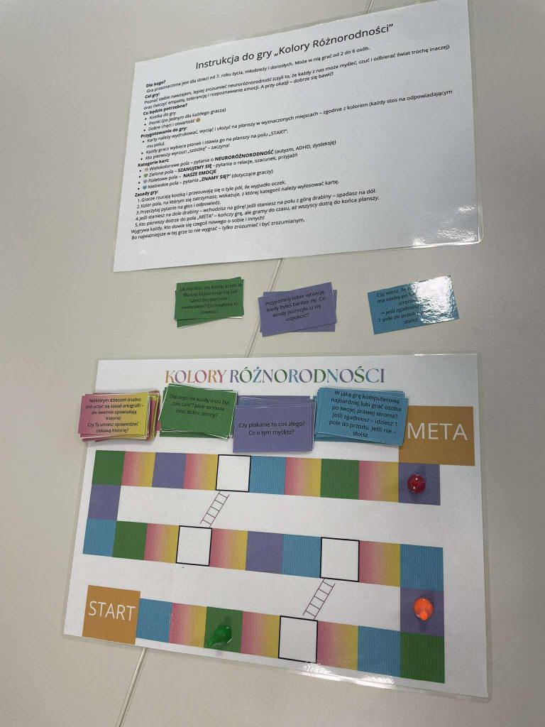 W ramach projektu stworzyli autorską grę planszową „Kolory Różnorodności”, która porusza tematy związane z neuroróżnorodnością – taką jak spektrum autyzmu, ADHD czy dysleksja – a także rozwija empatię, tolerancję i wiedzę o sobie nawzajem.