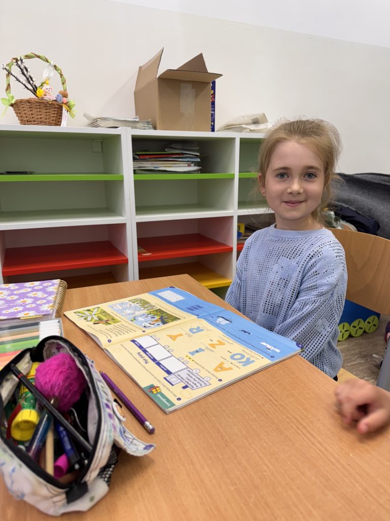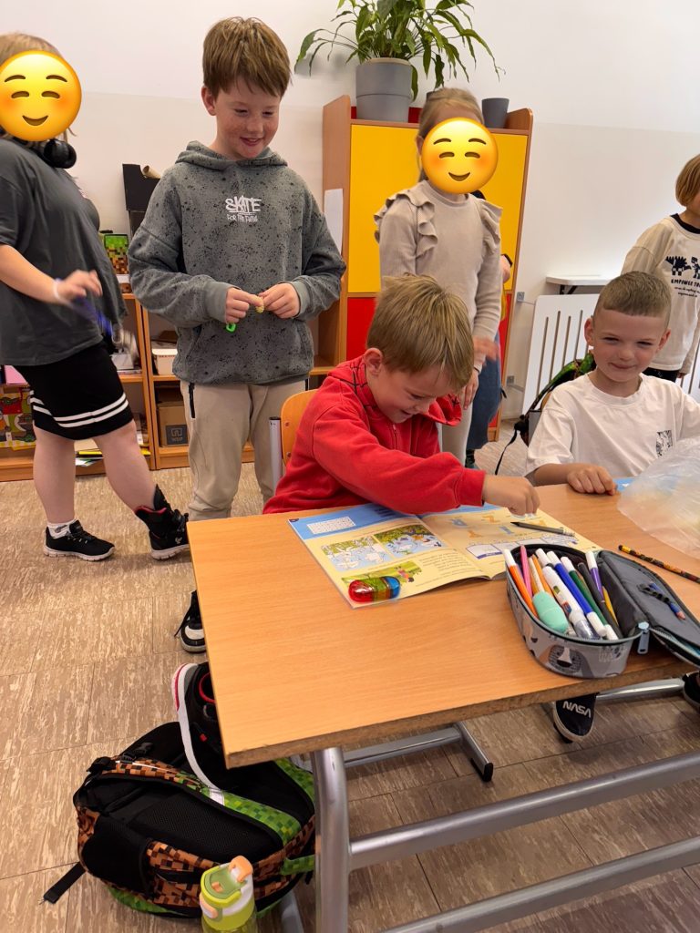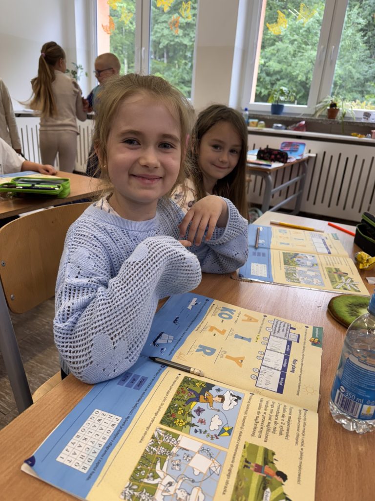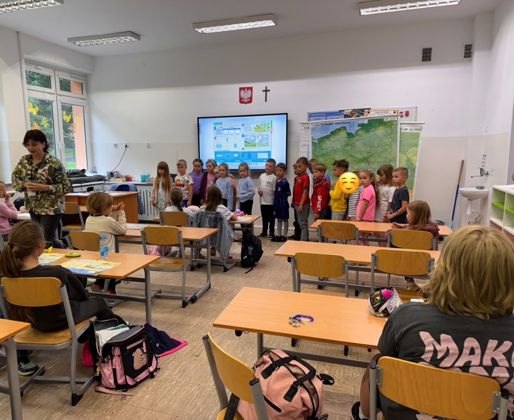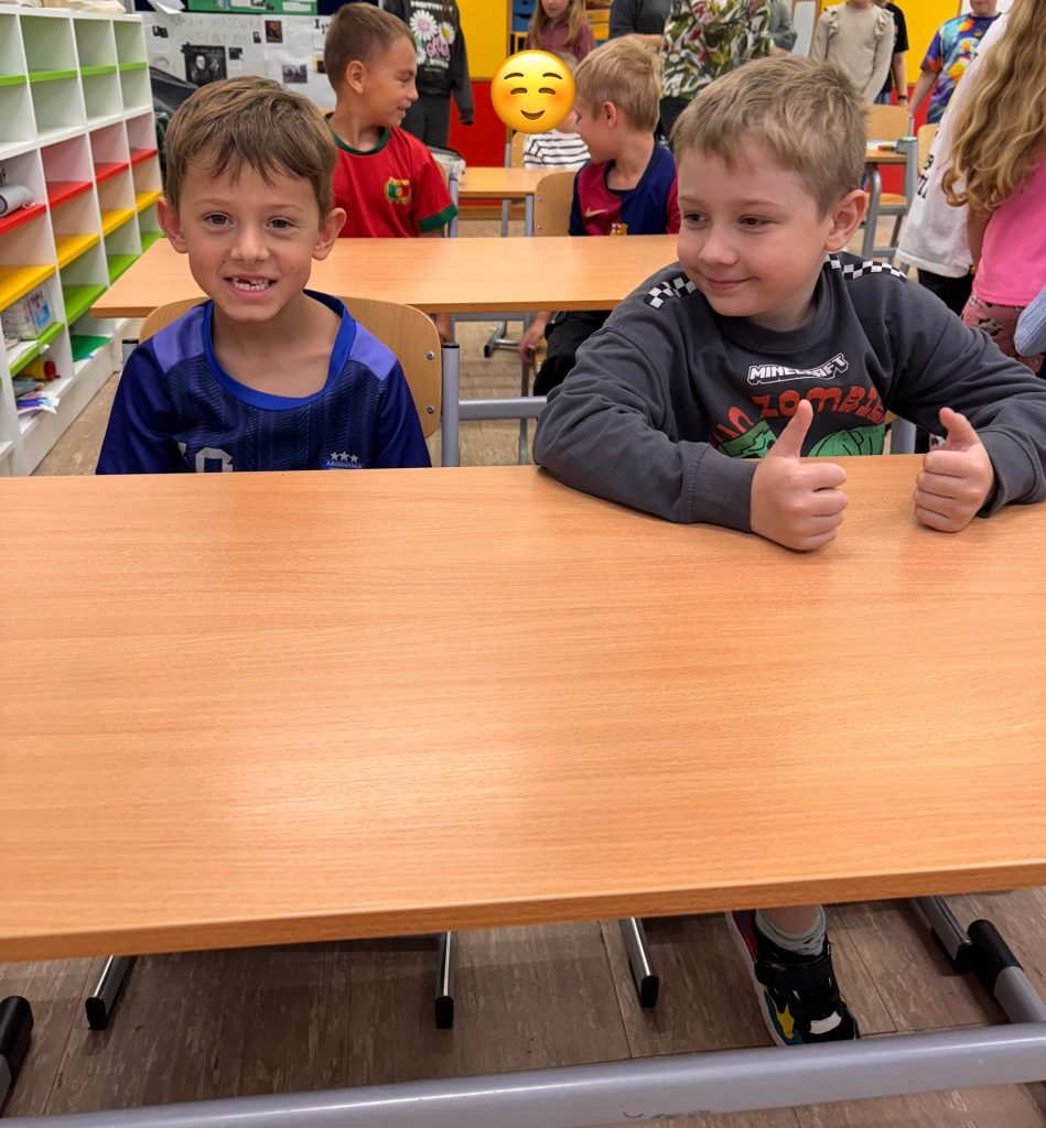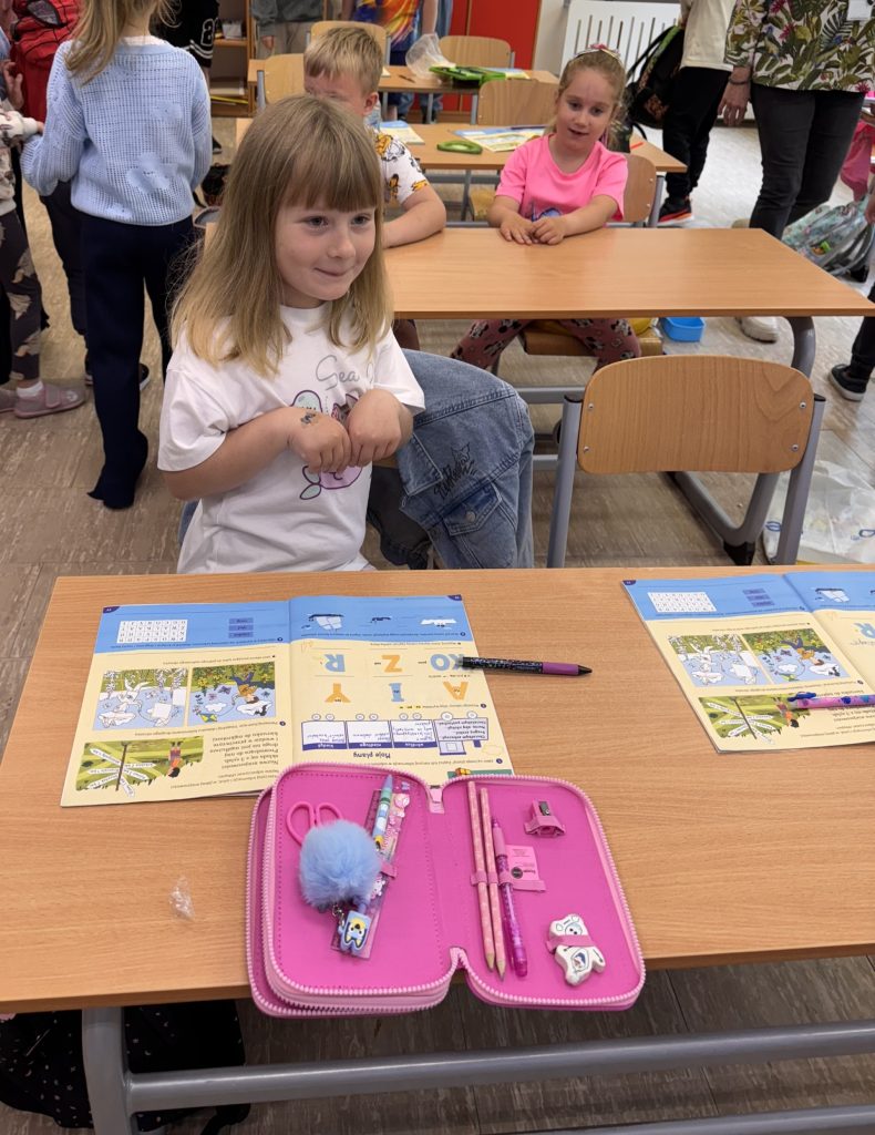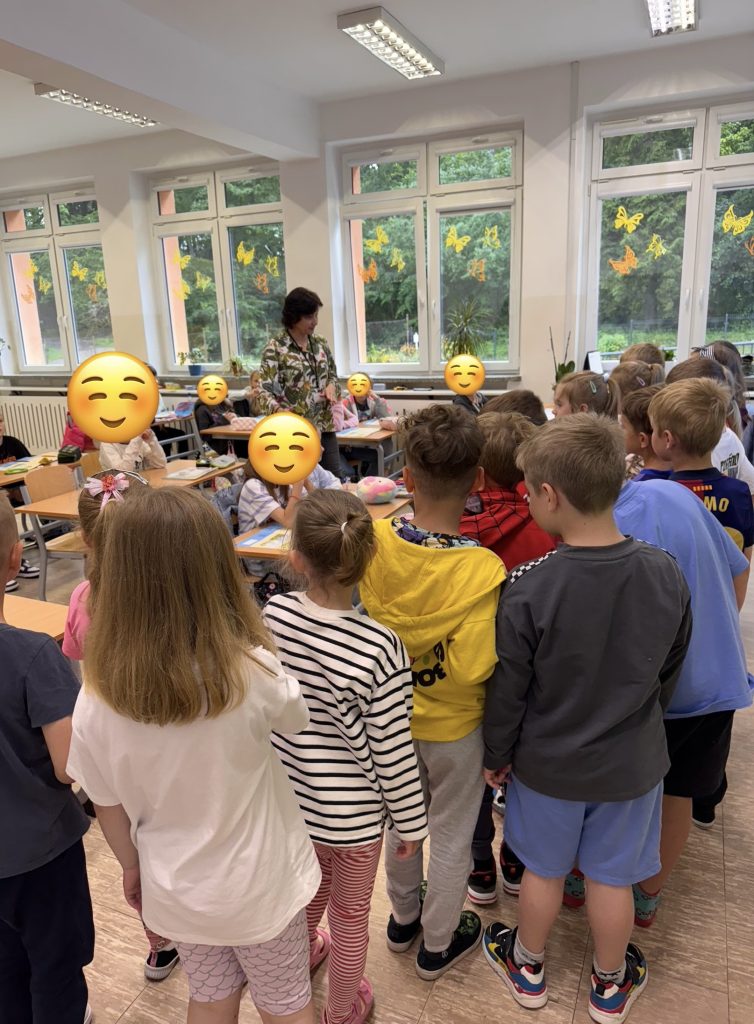 Dziękujemy również uczniom klasy 3 za zaśpiewanie dla nas piosenki, miłe rozmowy i życzenia dla dzieci na czas pierwszej klasy, która już za chwilę przed nimi 🙂 Dzieci były zachwycone możliwością zobaczenia od środka sali, mogły usiąść w ławce i poczuć się już uczniem.