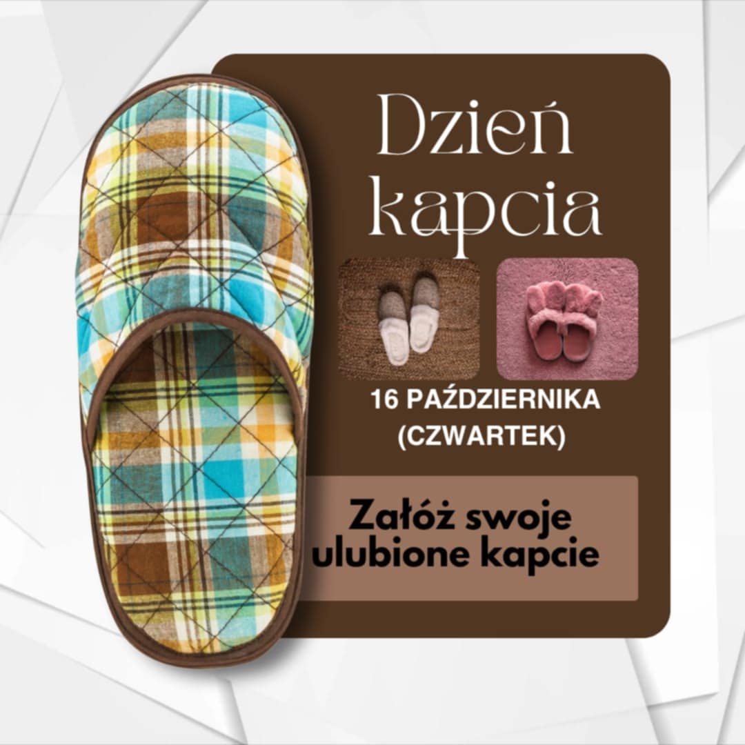 W czwartek, 16 października, obchodzimy w naszej szkole Dzień Kapcia! Tego dnia zostawiamy buty w szatni i chodzimy po szkole w kapciach, klapkach lub innych wygodnych pantoflach. To świetna okazja, by połączyć wygodę z zabawą i pokazać swoje oryginalne kapcie!