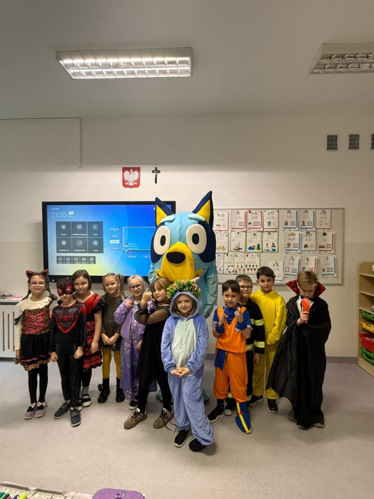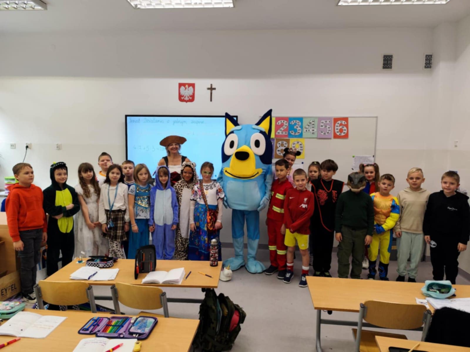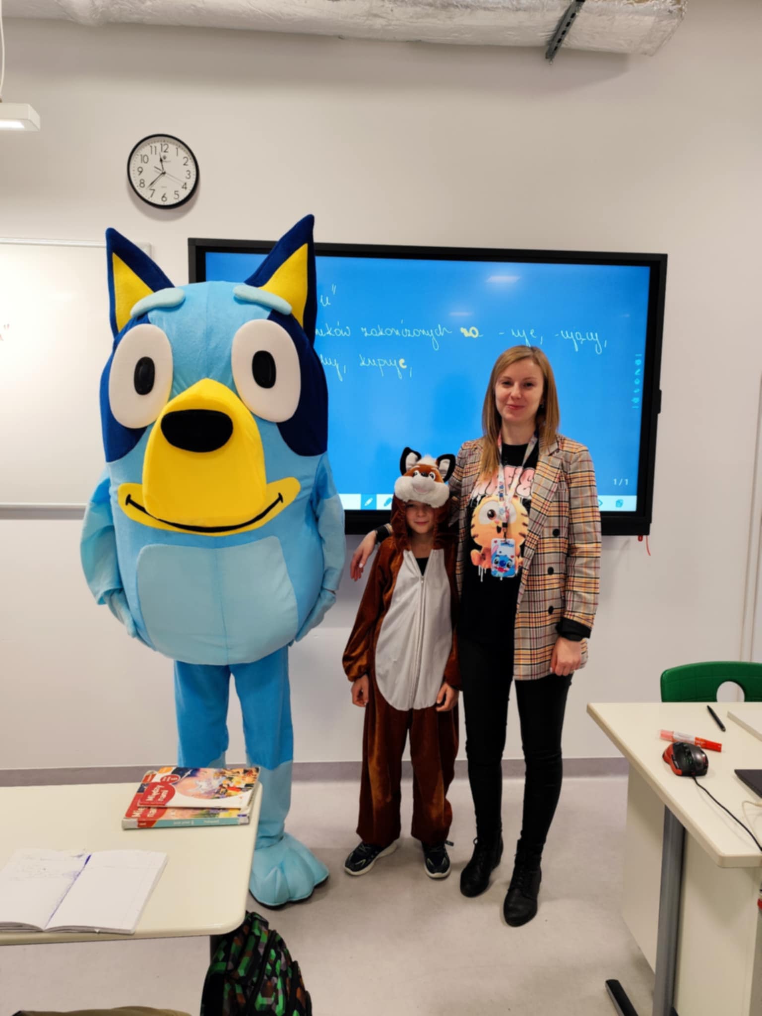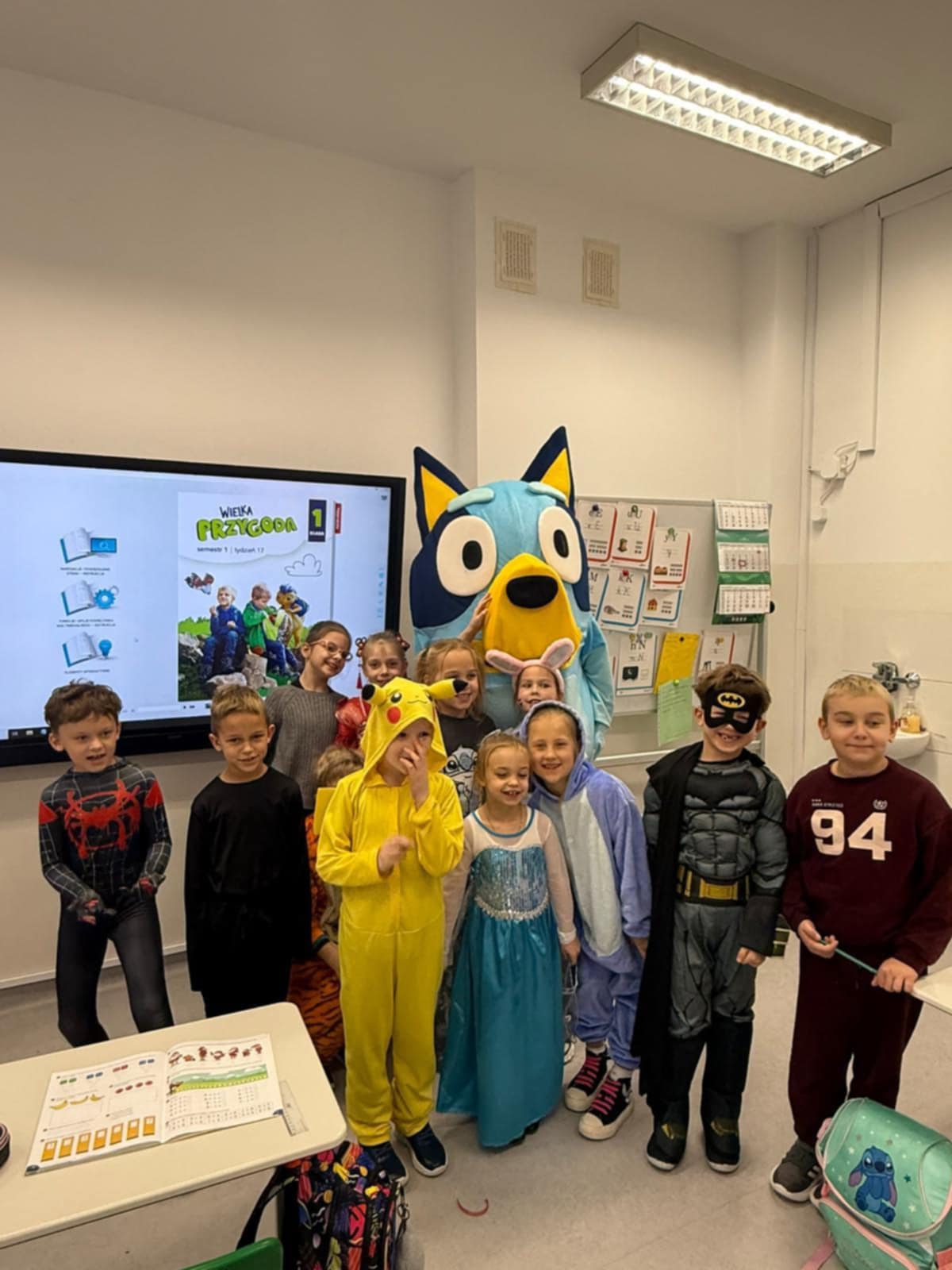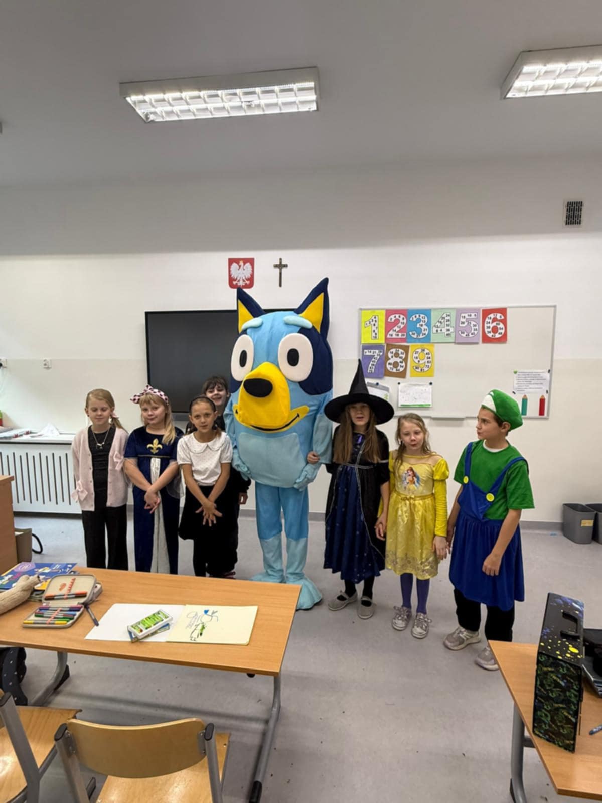 Atmosfera była pełna śmiechu, kreatywności i dobrej zabawy. Największą atrakcją dnia okazała się wizyta maskotki Blue, która wzbudziła ogromną furorę. Uczniowie z entuzjazmem przywitali gościa, robili sobie zdjęcia i przybijali „piątki”. Radość najmłodszych była nie do opisania, a szerokie uśmiechy towarzyszyły im do końca dnia.