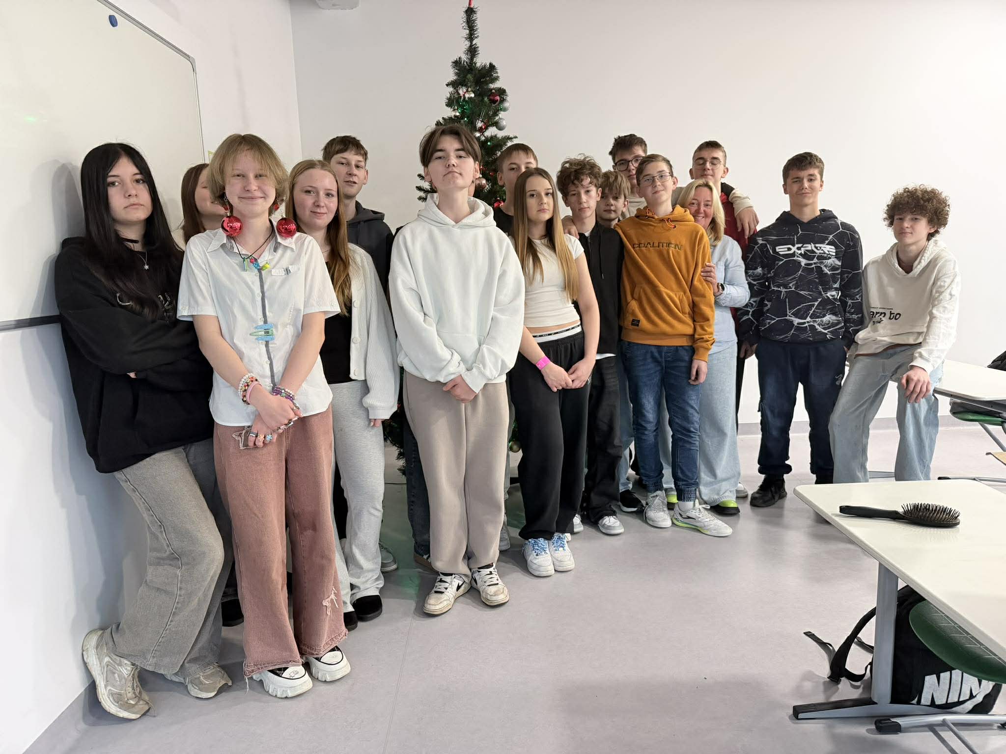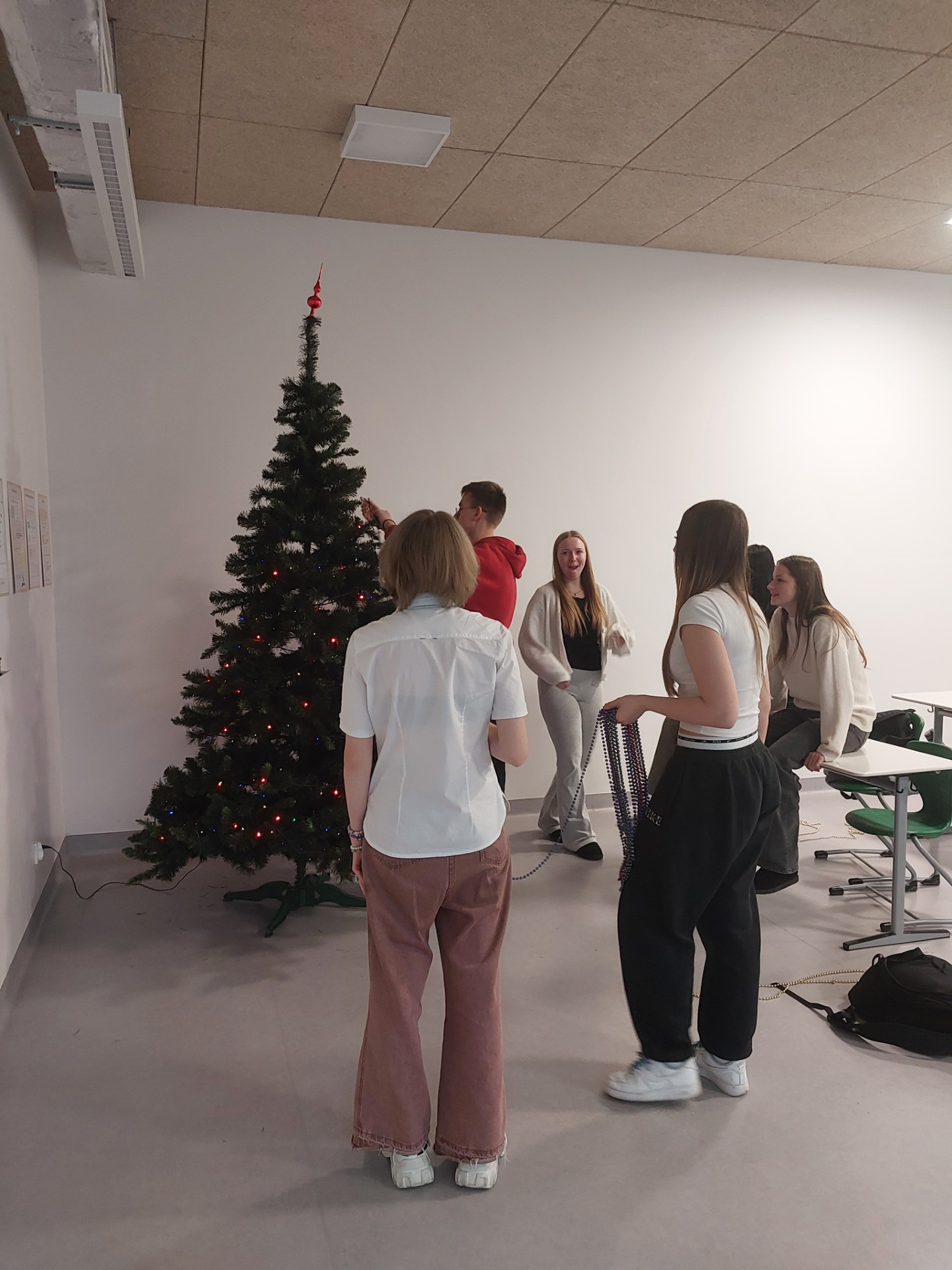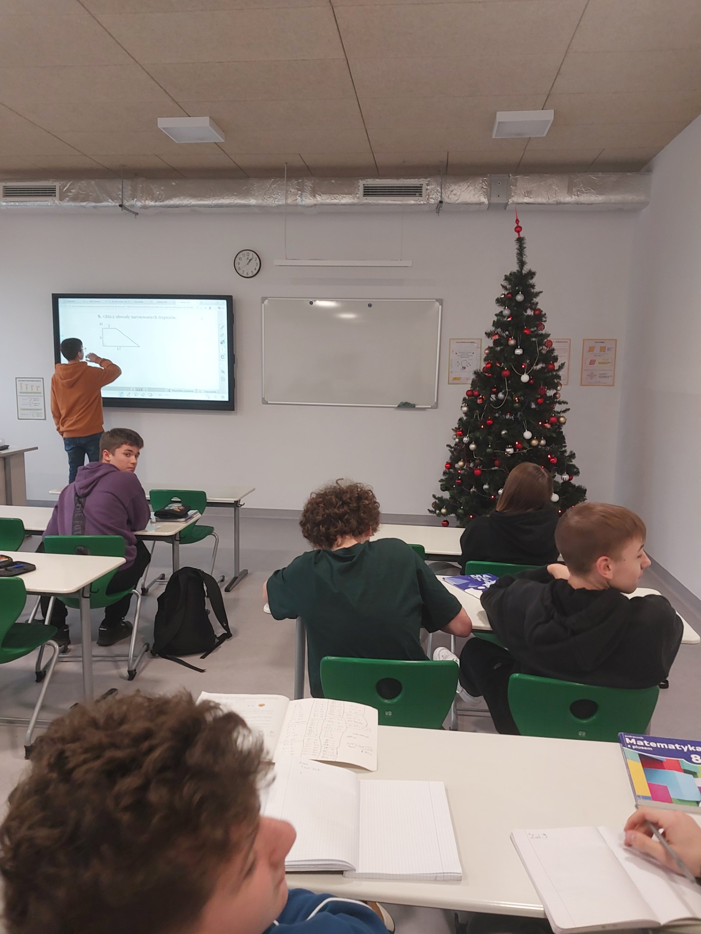 Tradycyjnie z okazji Mikołajek uczniowie klasy 8 B wraz z wychowawczynią ubrali choinkę. I tak będzie cieszyć nam oko do Świąt i wprowadzać świąteczny nastrój na matematyce.