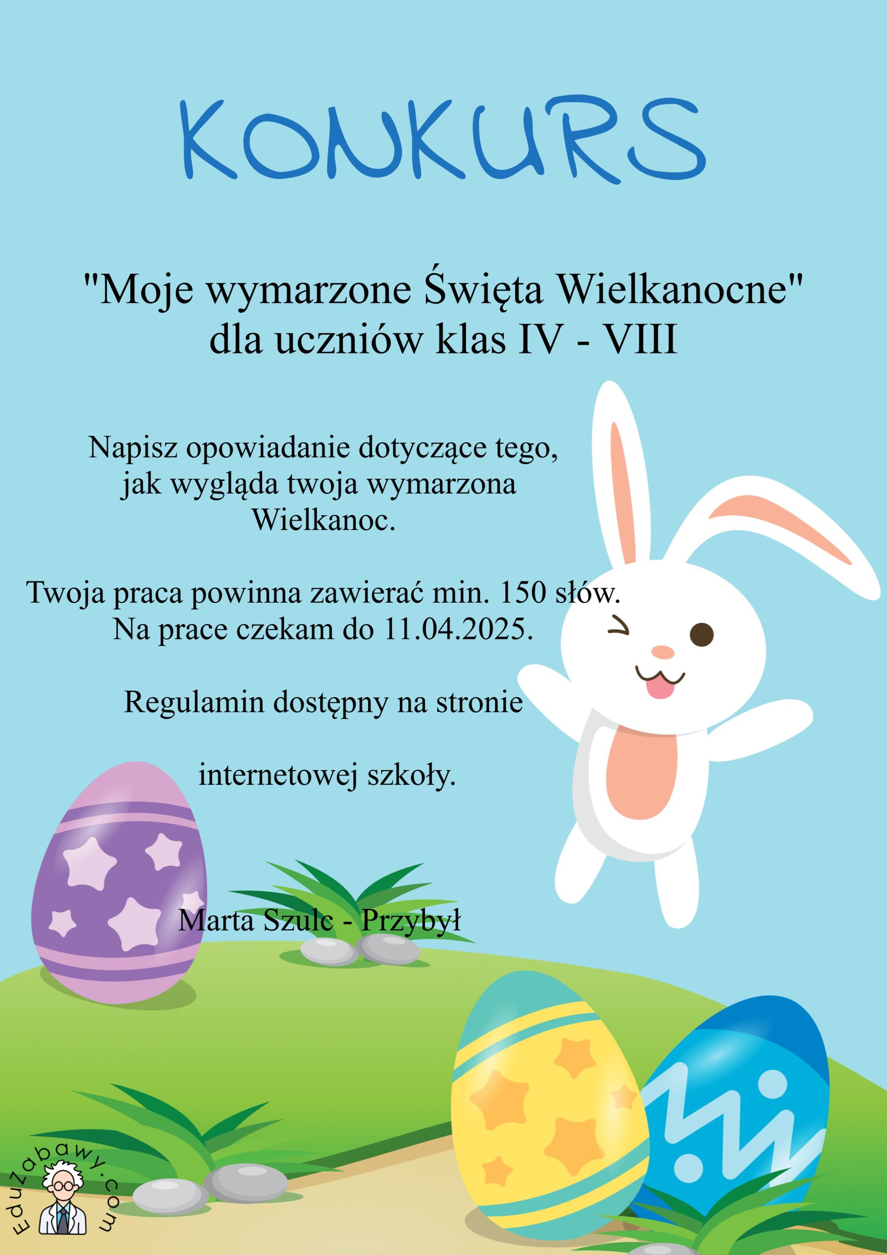 Serdecznie zapraszam do wzięcia udziału w szkolnym konkursie „Moje wymarzone Święta Wielkanocne” dla uczniów klas IV – VIII. Wykaż się pisarską kreatywnością i stwórz pracę pisemną – opowiadanie.