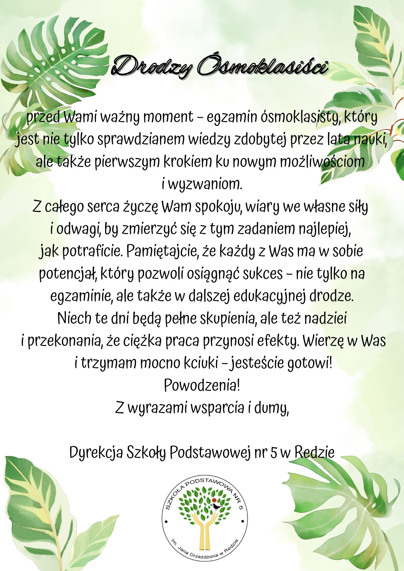 Życzenia dla Ósmoklasistów przez Marta Szulc - Przybył · 12 maja 2025 życzenia dla ósmoklasistówPobierz Autorki: Dyrekcja SP 5