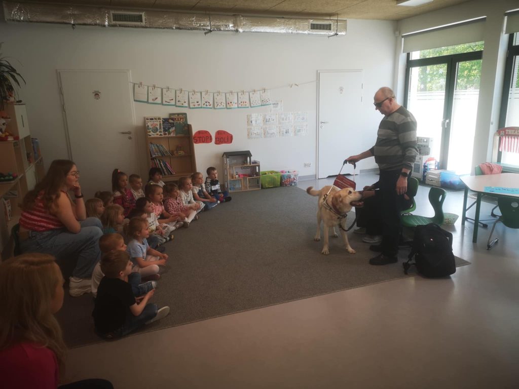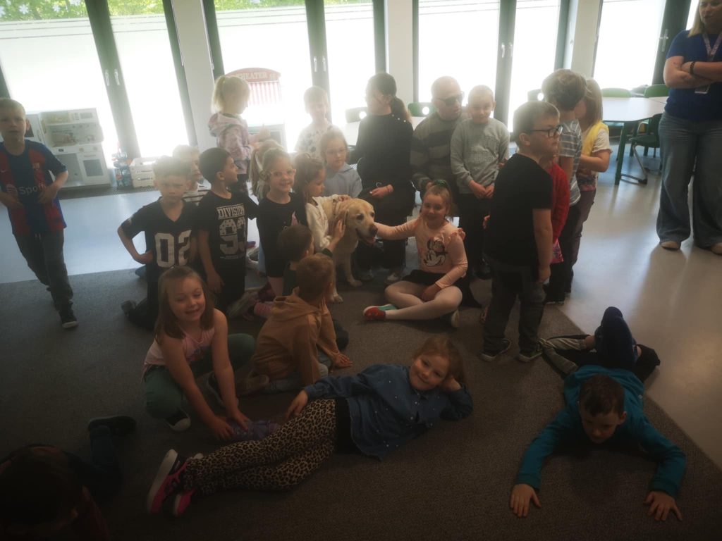 W tym tygodniu gościliśmy niewidomego Pana z psem przewodnikiem. Piesek jest już na psiej emeryturze, ale 10 lat służył Panu w codziennym życiu i jest Jego najwierniejszym przyjacielem. Piękna lekcja dla naszych przedszkolaków.