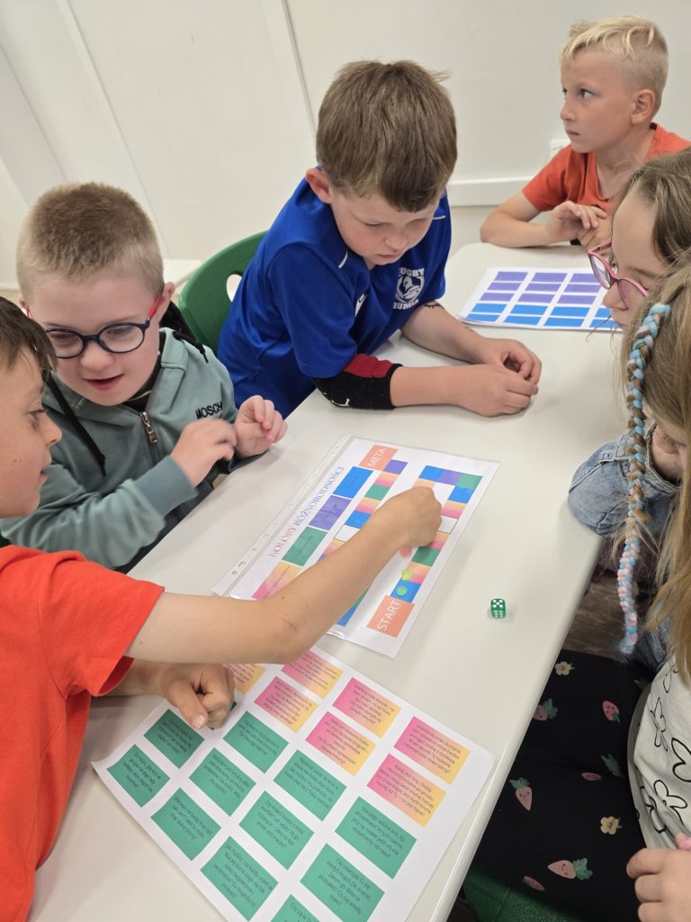 W ramach zajęć rozwijających kompetencje emocjonalno-społeczne uczniowie klasy 6a (z pomocą Pani Justyny 😊) stworzyli autorską grę planszową „Kolory Różnorodności”.
