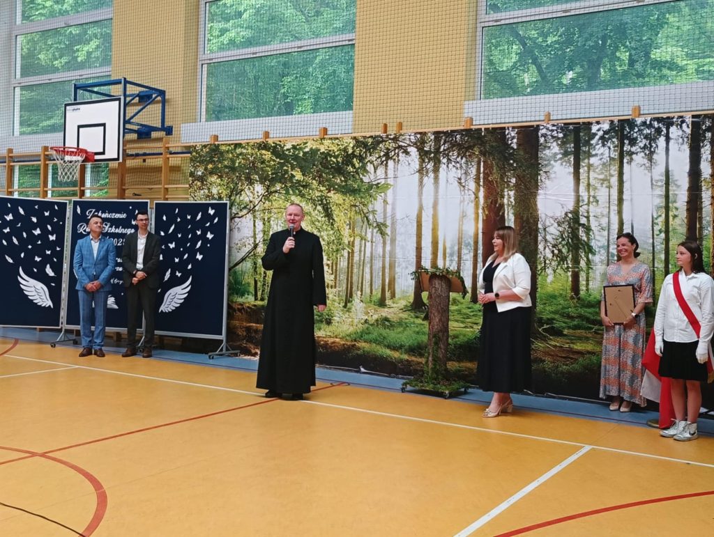 Ksiądz Proboszcz Fabian Tokarski, który skierował do uczniów słowa wsparcia, wdzięczności oraz życzenia duchowego i fizycznego odpoczynku podczas wakacji.