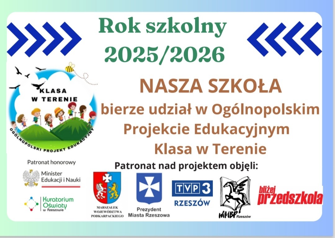 Z radością pragniemy poinformować, iż nasza Szkoła kolejny raz bierze udział w Ogólnopolskim Projekcie Edukacyjnym Klasa w Terenie pod patronatem honorowym Ministra Edukacji i Nauki. Głównym celem edukacyjnego projektu ,,Klasa w terenie” jest promowanie wartości edukacji na świeżym powietrzu. Zachęcenie nauczycieli i uczniów do „opuszczenia” swoich sal lekcyjnych i spędzenia czasu poza budynkiem szkoły. Wszystko po to, aby promować edukację terenową – prawdopodobnie najbardziej uszczęśliwiającą formę edukacji na świecie, angażującą różne zmysły.