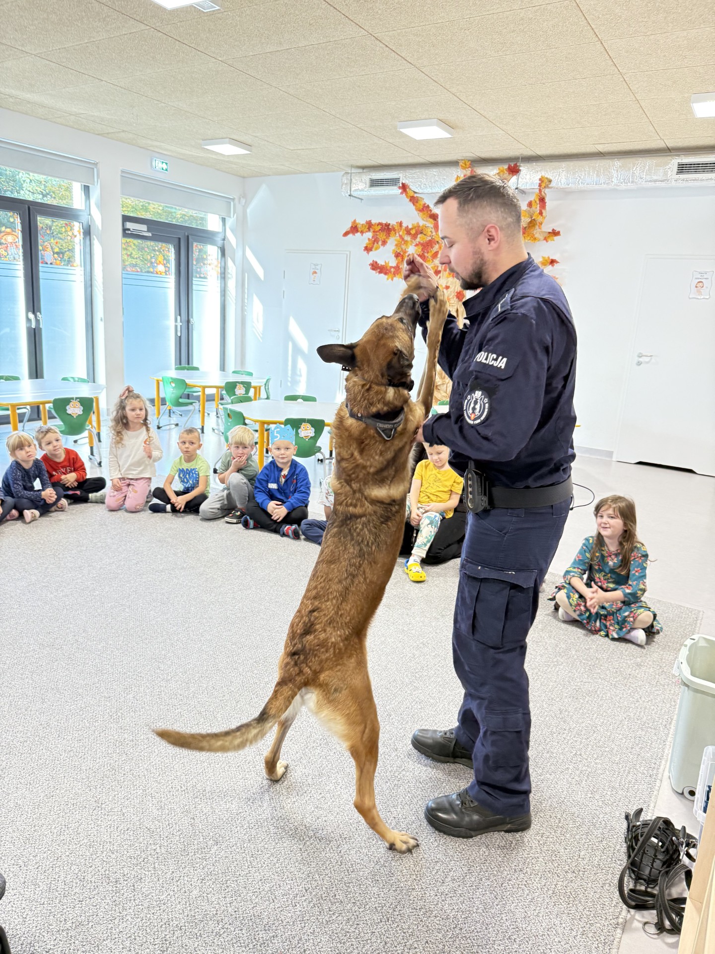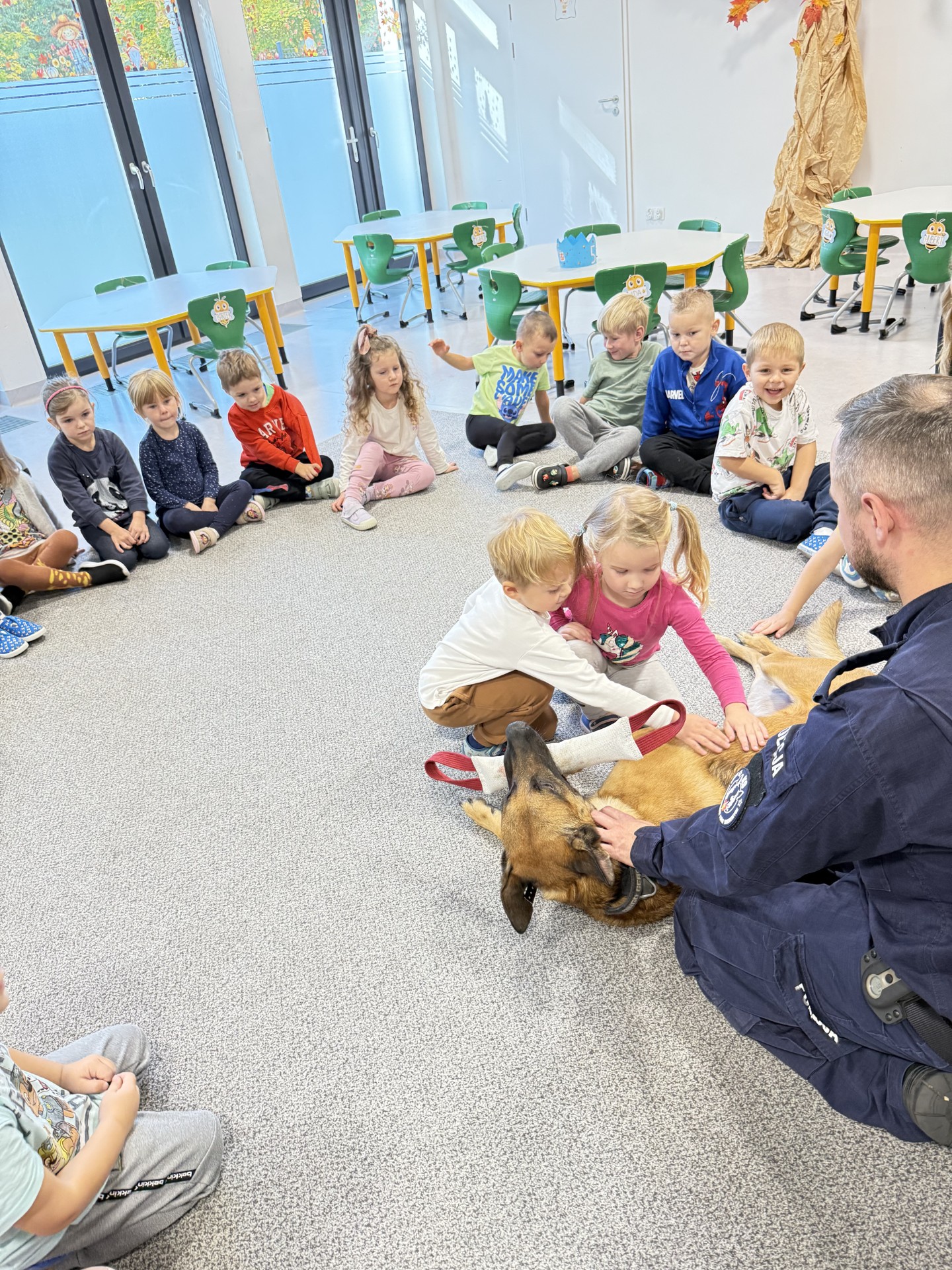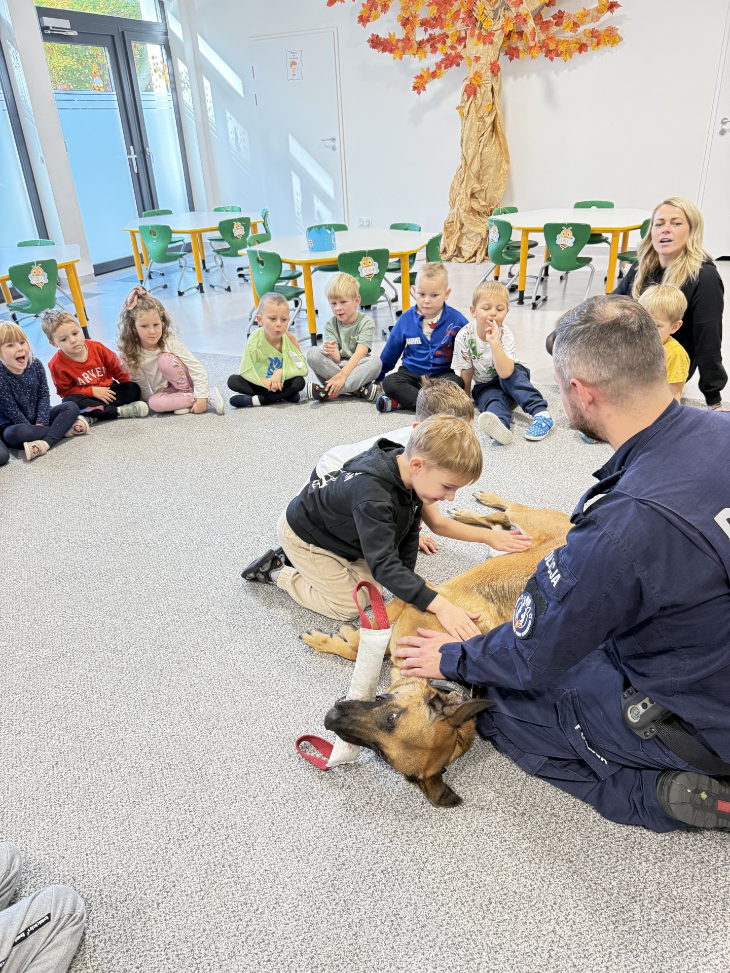 Dzisiaj w grupie 0 C gościliśmy policjanta ze swoim psem tropiącym. Bardzo dziękujemy, że mogliśmy dowiedzieć się tylu ważnych informacji na temat specyfiki pracy w policji, a Szogun to bardzo mądry i słodki psiak, który uwielbia jeść parówki.
