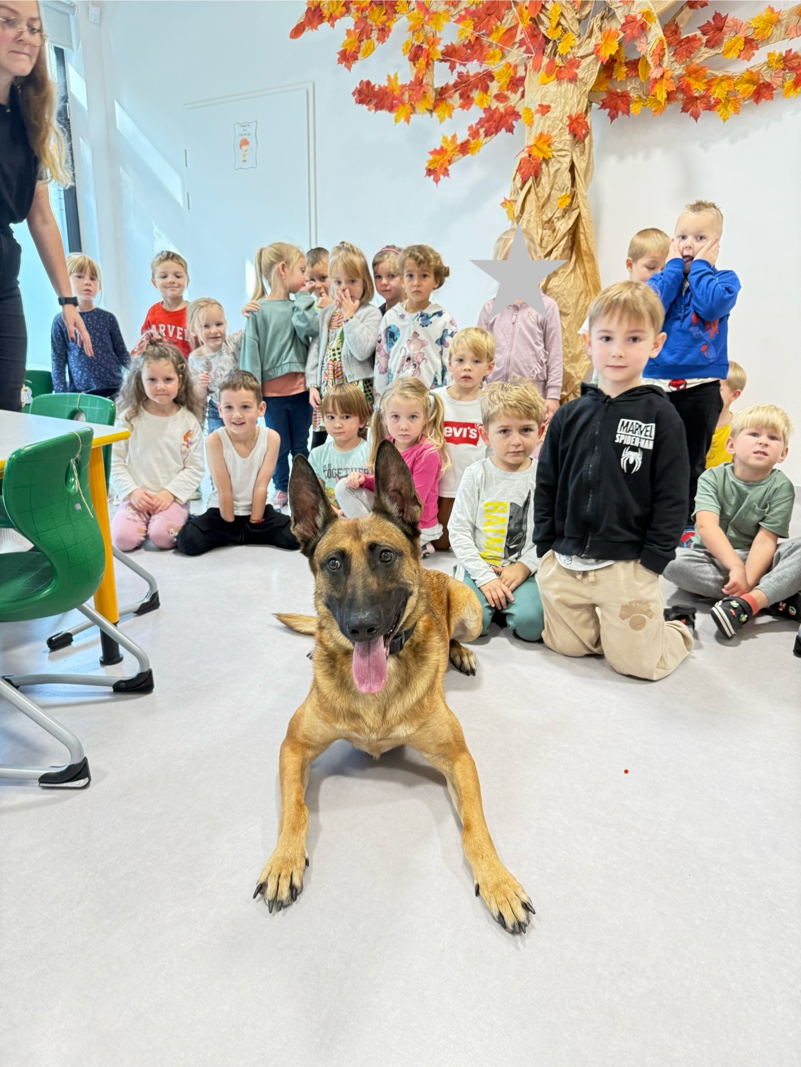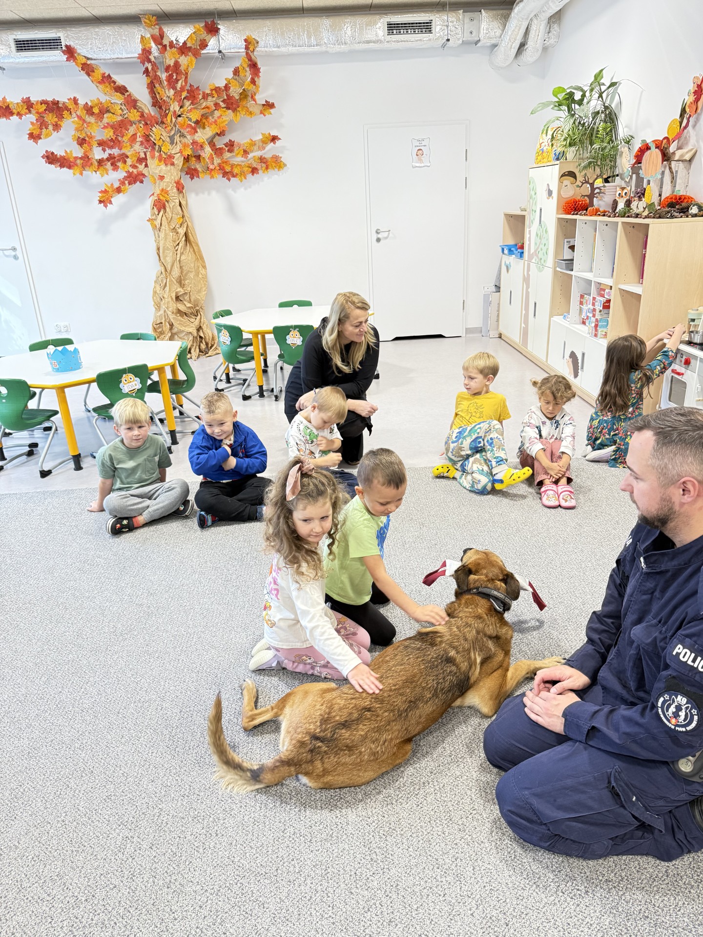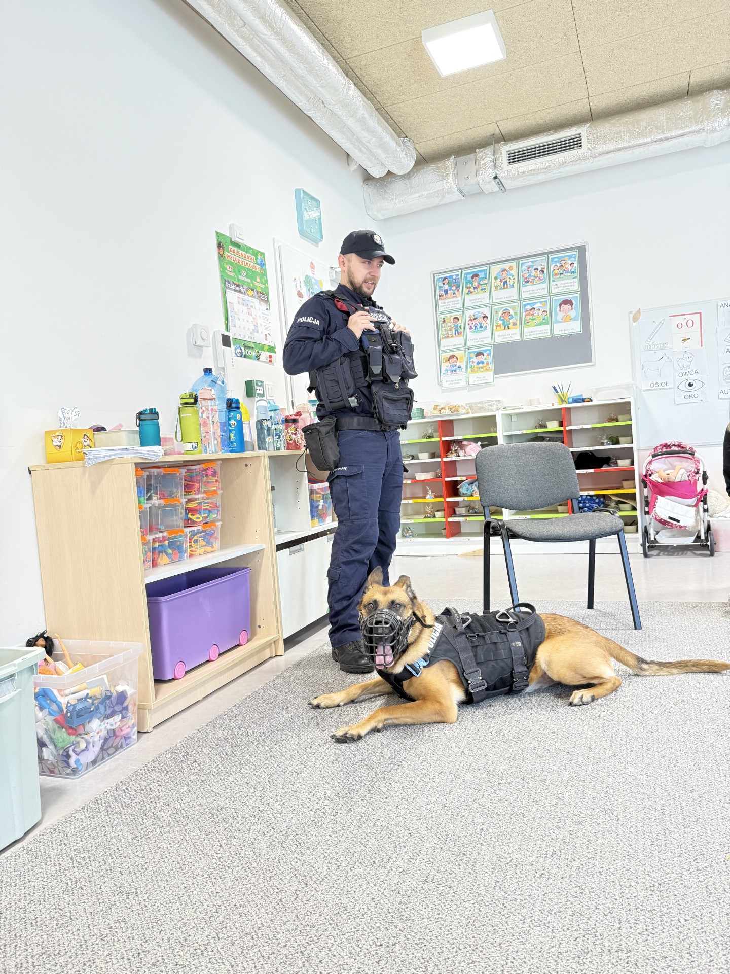 Dzisiaj w grupie 0 C gościliśmy policjanta ze swoim psem tropiącym. Bardzo dziękujemy, że mogliśmy dowiedzieć się tylu ważnych informacji na temat specyfiki pracy w policji, a Szogun to bardzo mądry i słodki psiak, który uwielbia jeść parówki.