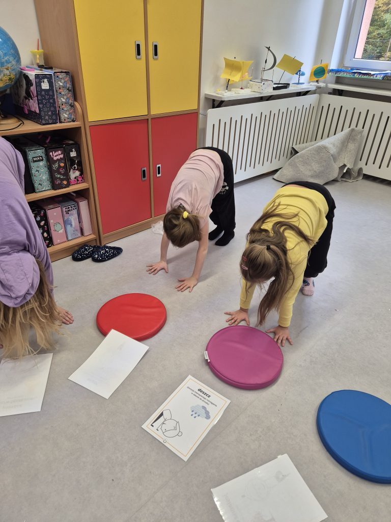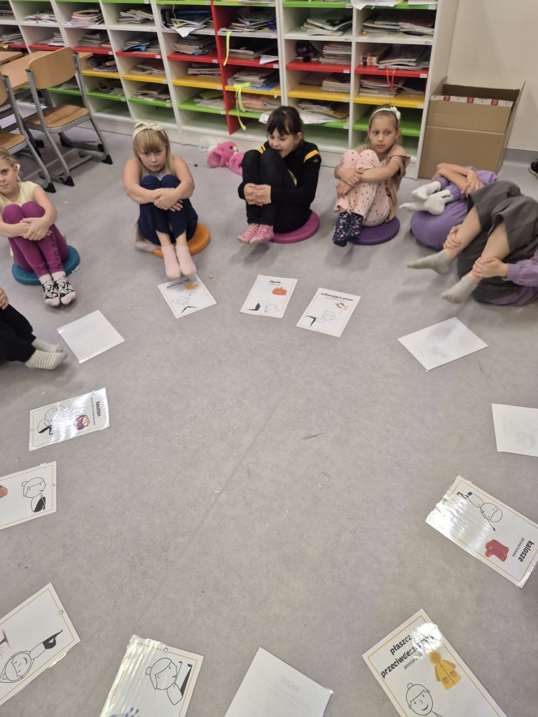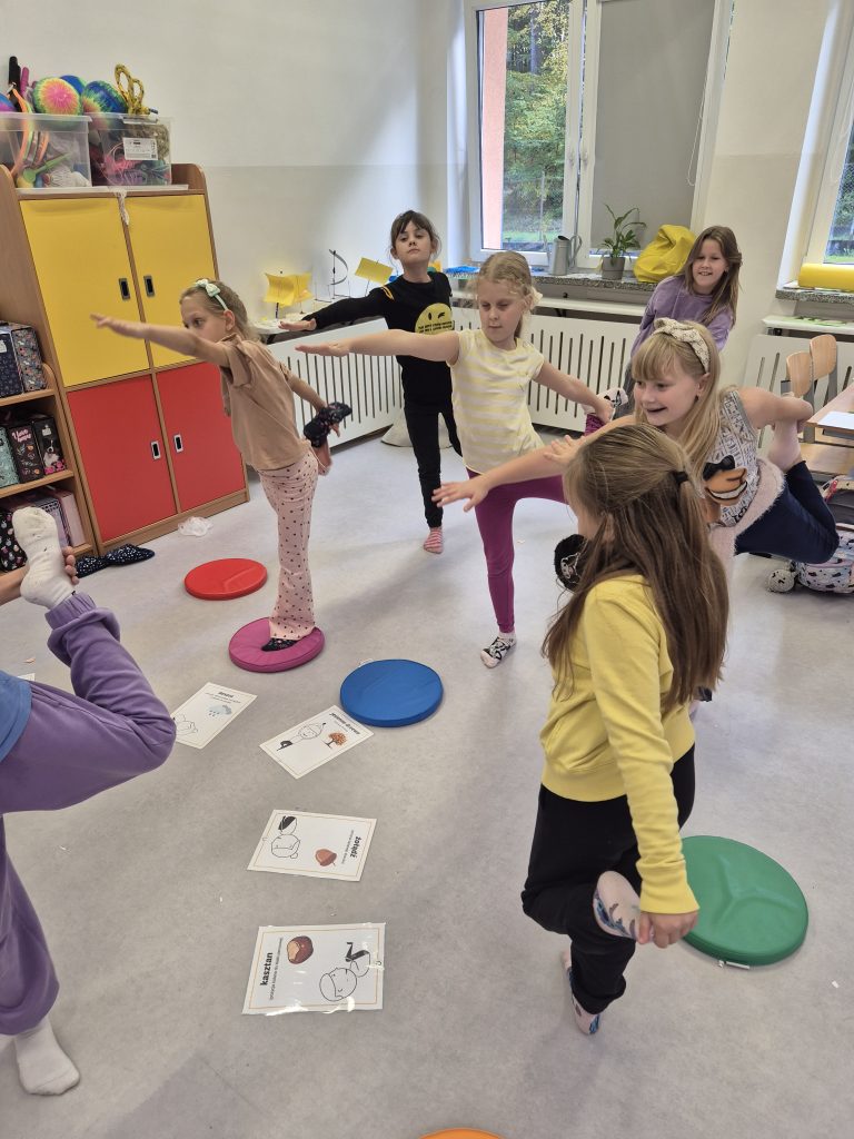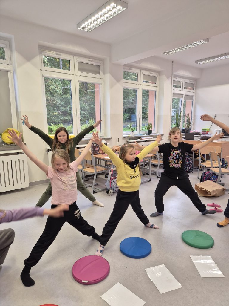 Dzieci uczestniczyły w zabawach ruchowych inspirowanych jesienią, poznały 12 pozycji jogi w formie kart ruchowych oraz ćwiczyły uważny oddech i rozluźnianie ciała.