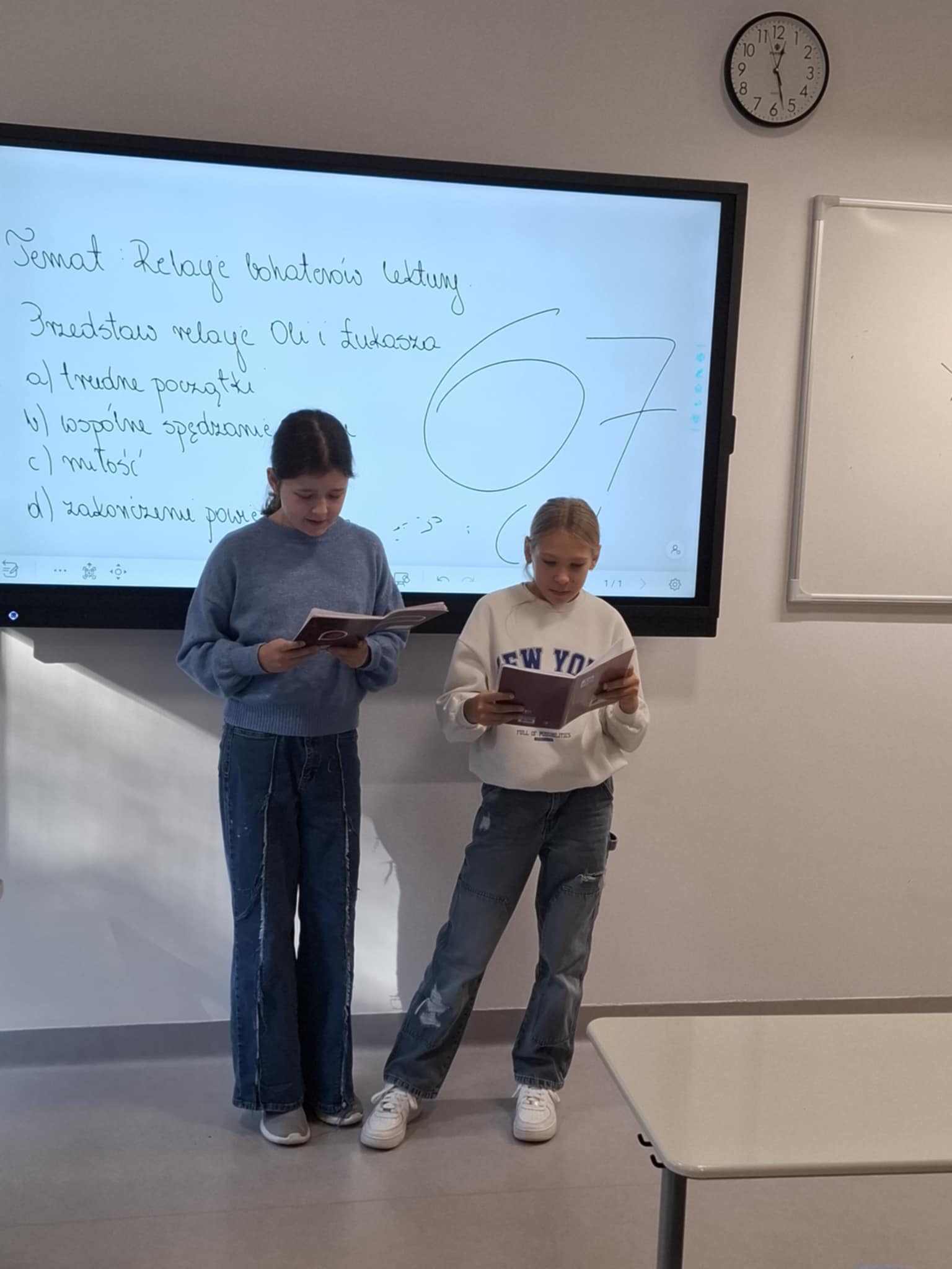 W poniedziałek uczniowie klasy 5 b pracowali w grupach. Ich zadaniem było nazwanie emocji, które towarzyszyły głównym bohaterom lektury „Pajączek na rowerze”. To wspaniała lektura, która opowiada o skomplikowanych relacjach rodzinnych, o narodzinach przyjaźni oraz pierwszej miłości. Uczniowie wspaniale poradzili sobie z zadaniem, tworząc ciekawe prace dotyczące uczuć, które panowały między głównymi bohaterami powieści – Olą i Łukaszem.