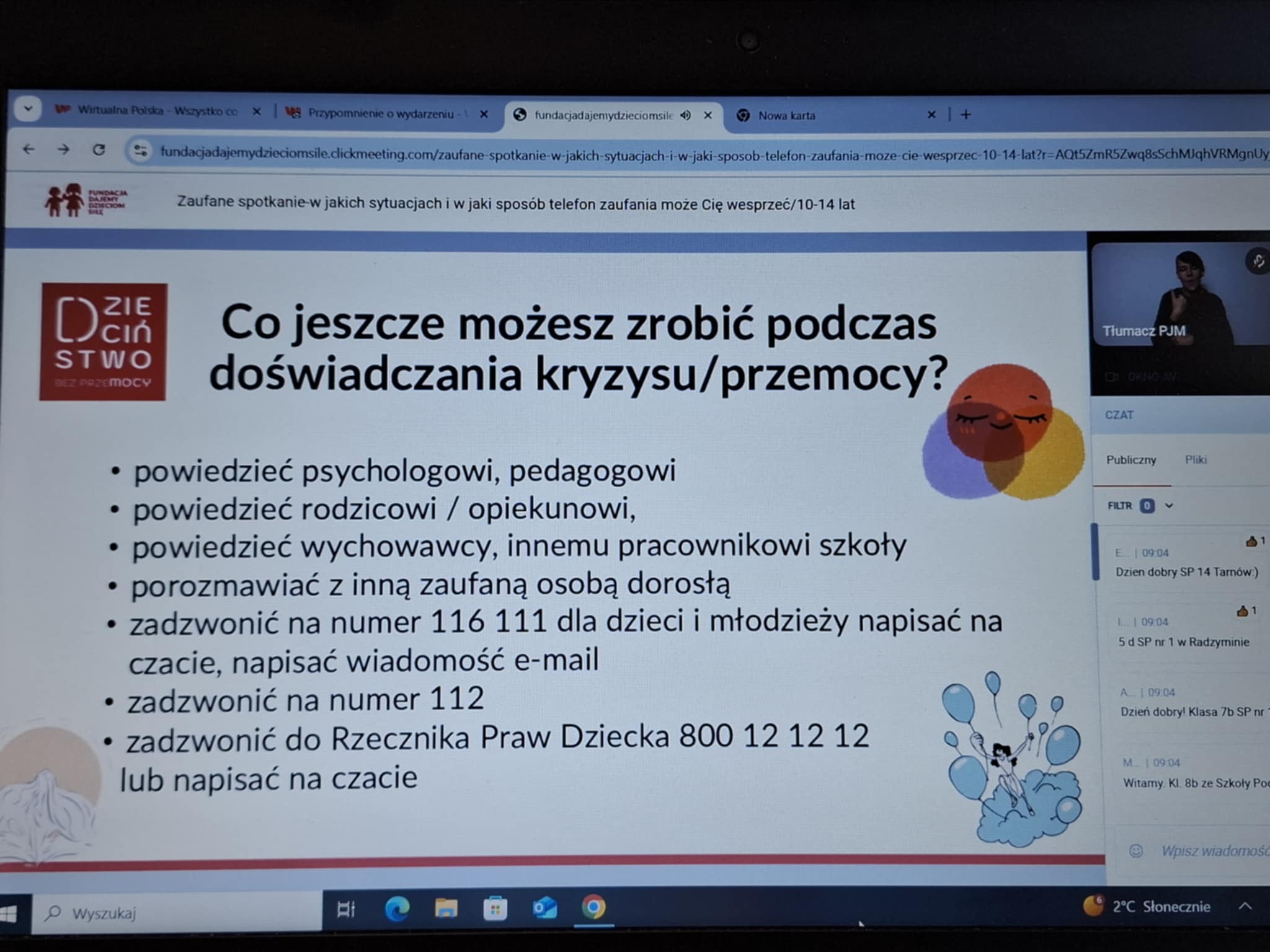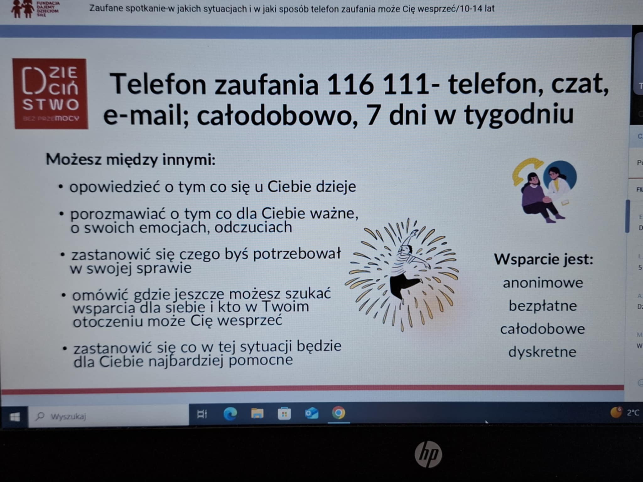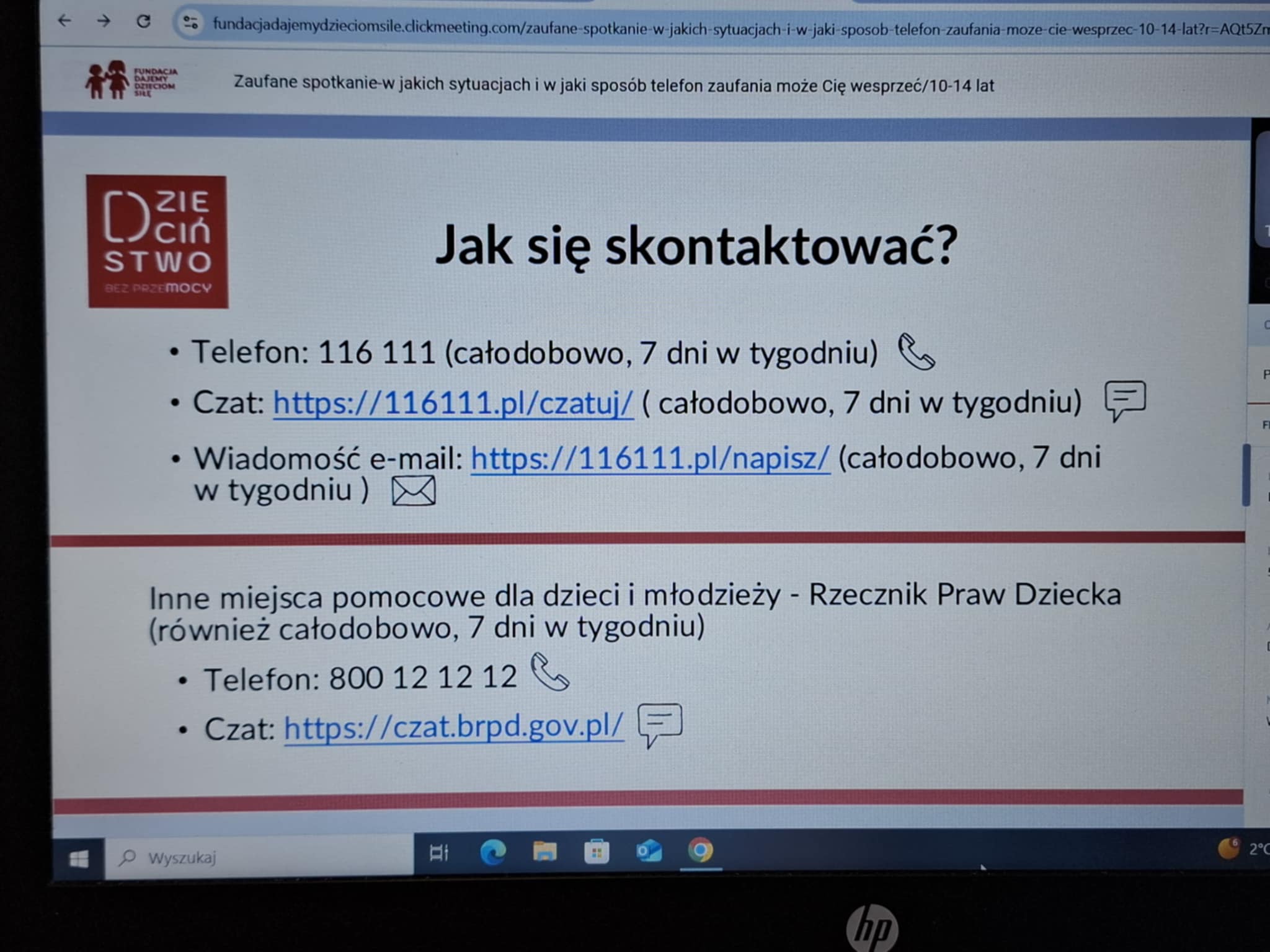 Ważnym elementem zajęć online była tematyka związana z tym, gdzie należy szukać pomocy kiedy znajduje się w sytuacji trudnej lub przemocowej. Nauczyciele i specjaliści to osoby, które zrobią wszystko, aby pomóc i wesprzeć. Jeśli jednak ktoś czuje, że potrzebuje porozmawiać z kimś innym, nieznanym, wówczas warto skorzystać z telefonów zaufania, których numery znajdują się na fotografiach.