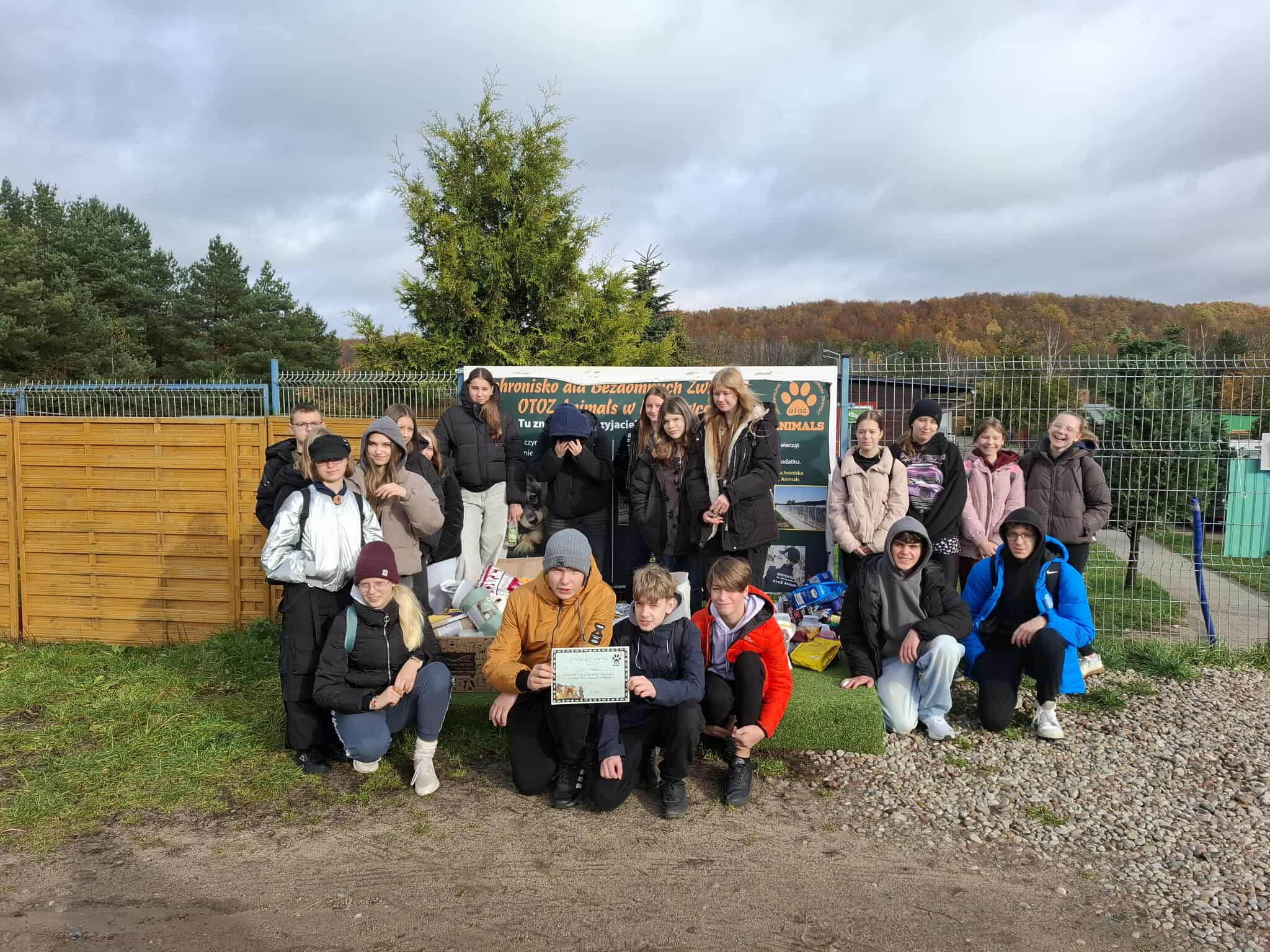 W środę – 29 października Wolontariusze z klas VI – VIII wraz z opiekunami: Panią Ireną Stępniewską i Panią Martą Szulc – Przybył udali się do Schroniska OTOZ Animals w Dąbrówce. Głównym celem naszej wizyty było przekazanie zebranej karmy, misek oraz koców.
