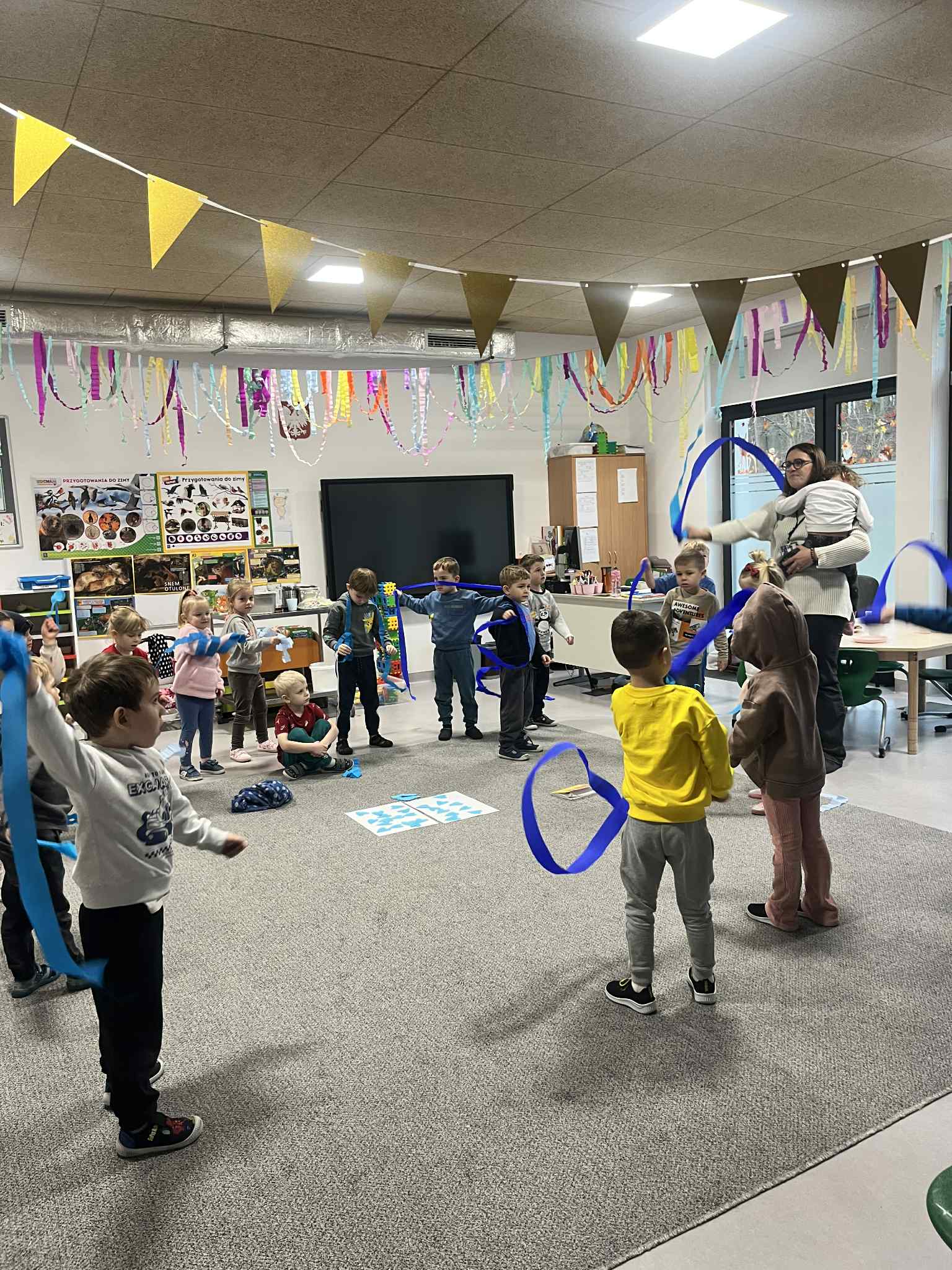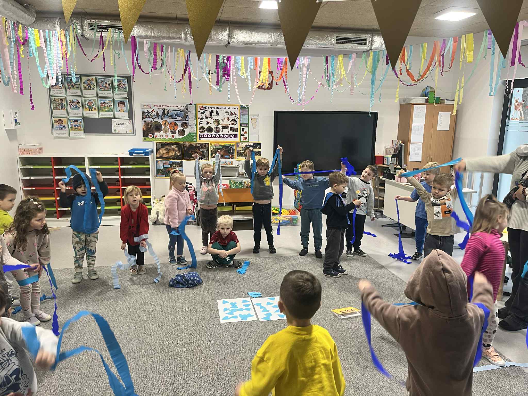 Niebieskie serduszka, niebieskie krepowe wstążki zagościły w sali Pszczółek.