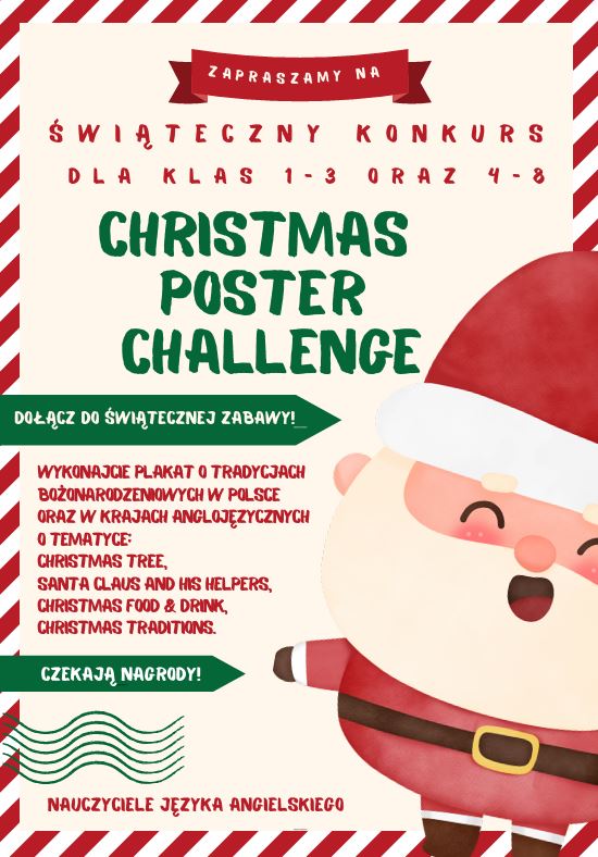 Zapraszamy wszystkich uczniów Szkoły Podstawowej nr 5 w Redzie do udziału w świątecznym konkursie „Christmas Poster Challenge”! To doskonała okazja, aby połączyć kreatywność z nauką języka angielskiego oraz poznać tradycje bożonarodzeniowe w Polsce i krajach anglojęzycznych.