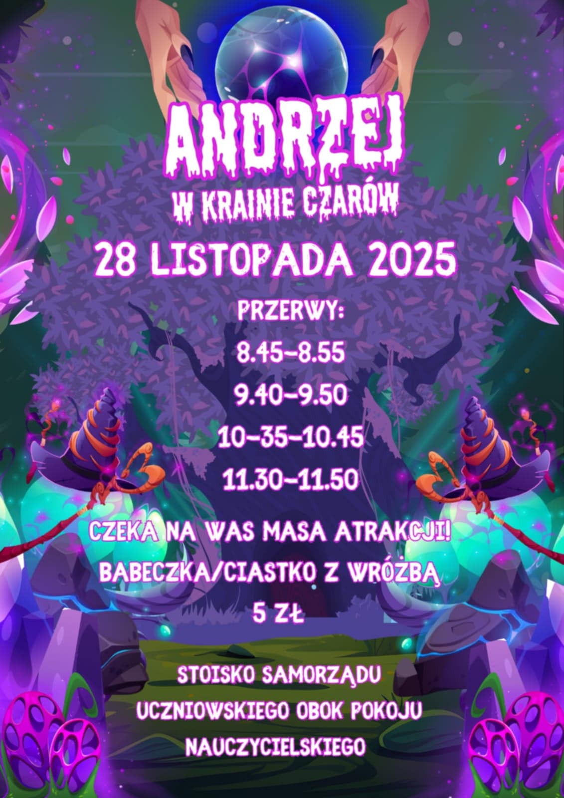 Już 28 listopada 2025 roku (w piątek) zapraszamy wszystkich uczniów klas I-VIII do udziału w wyjątkowych szkolnych Andrzejkach, przygotowanych przez Samorząd Uczniowski. Tegorocznym motywem wydarzenia jest „Kraina Czarów”, nie zabraknie magii, fantazji i niespodzianek!