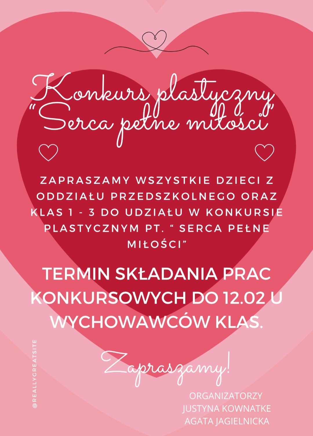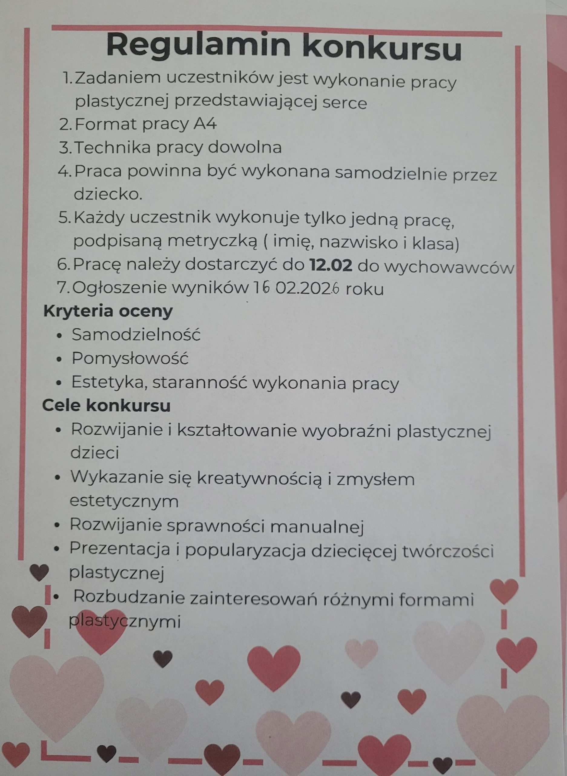 Serdecznie zapraszamy do wzięcia udziału w konkursie plastycznym pt. ” Serca pełne miłości’ dla uczniów klas 0 – 3. Termin składania prac do 12.02. Rozstrzygnięcie konkursu odbędzie się 16.02 .