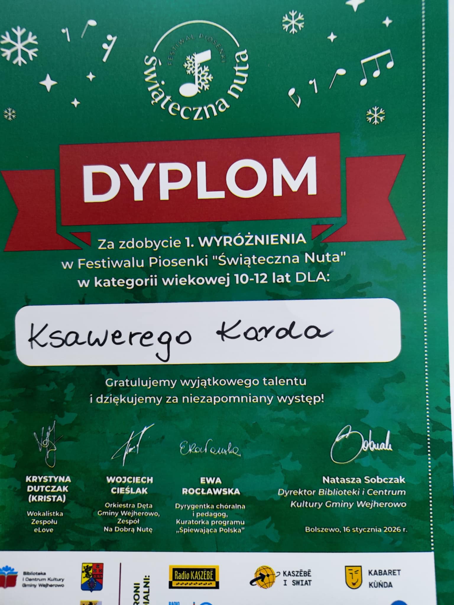 16 stycznia 2026 roku w Bolszewie odbył się festiwal piosenki „Świąteczna Nuta”. Naszą szkołę reprezentował uczeń Ksawery Karda, który zaprezentował się znakomicie i zdobył pierwsze wyróżnienie ![]()