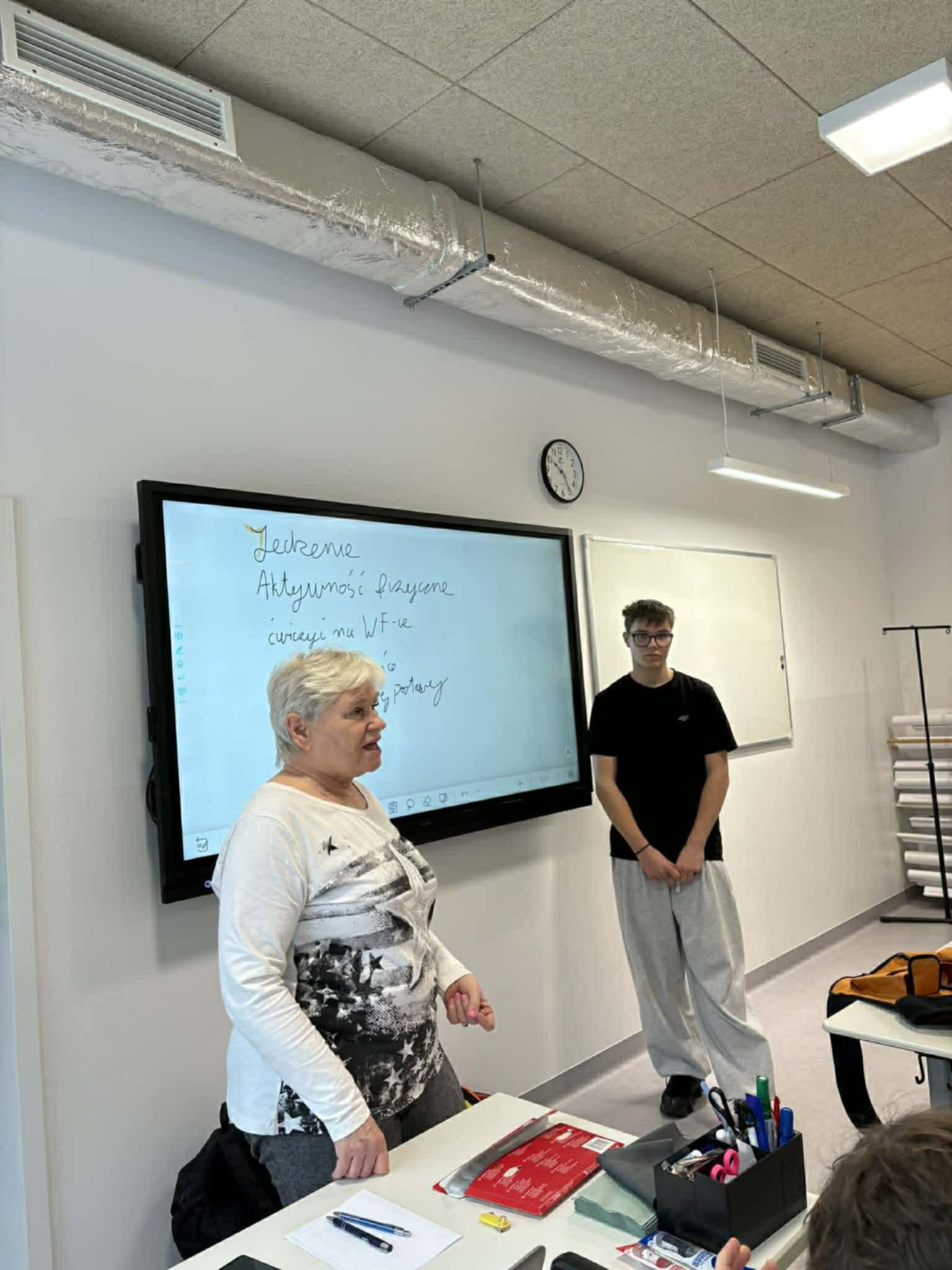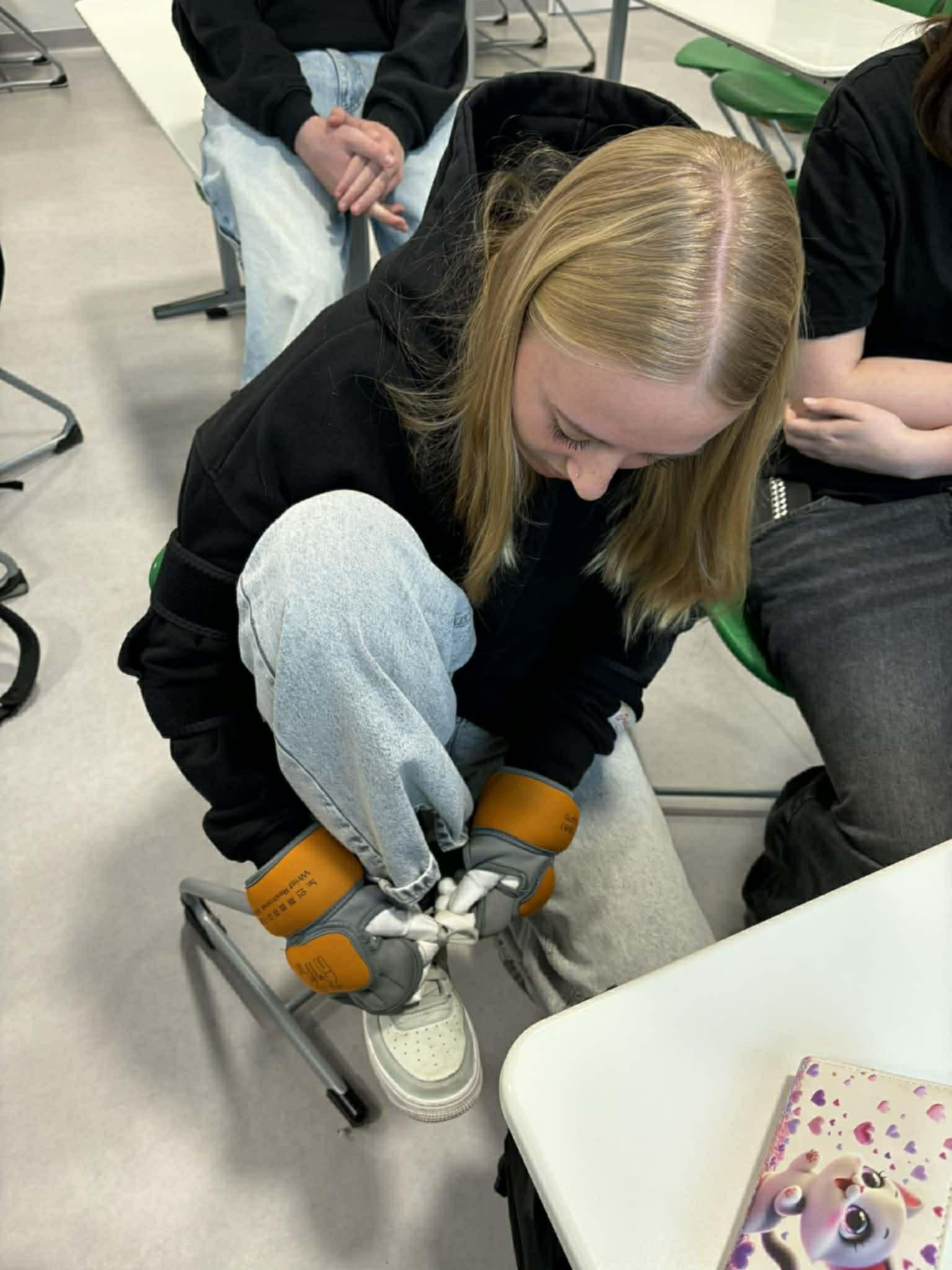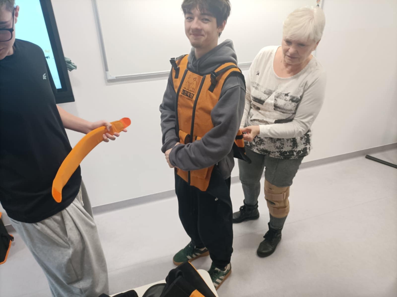 Uczniowie podzielili się na trzy grupy i mierzyli się z wyzwaniami takimi jak: przejść z obciążonymi plecami, brzuchem oraz nogami całą klasę w 10 sekund i usiąść na krześle oraz w całym zestawie podnieść coś z ziemi. Następnym wyzwaniem było wyjęcie w okularach i obciążnikach na nadgarstki z portfelika określoną ilość pieniędzy, napisać list lub nazwę naszej szkoły. Na końcu klasy miały okazje zapytać, jak być tak samo sprawnym jak Pani Zofia .