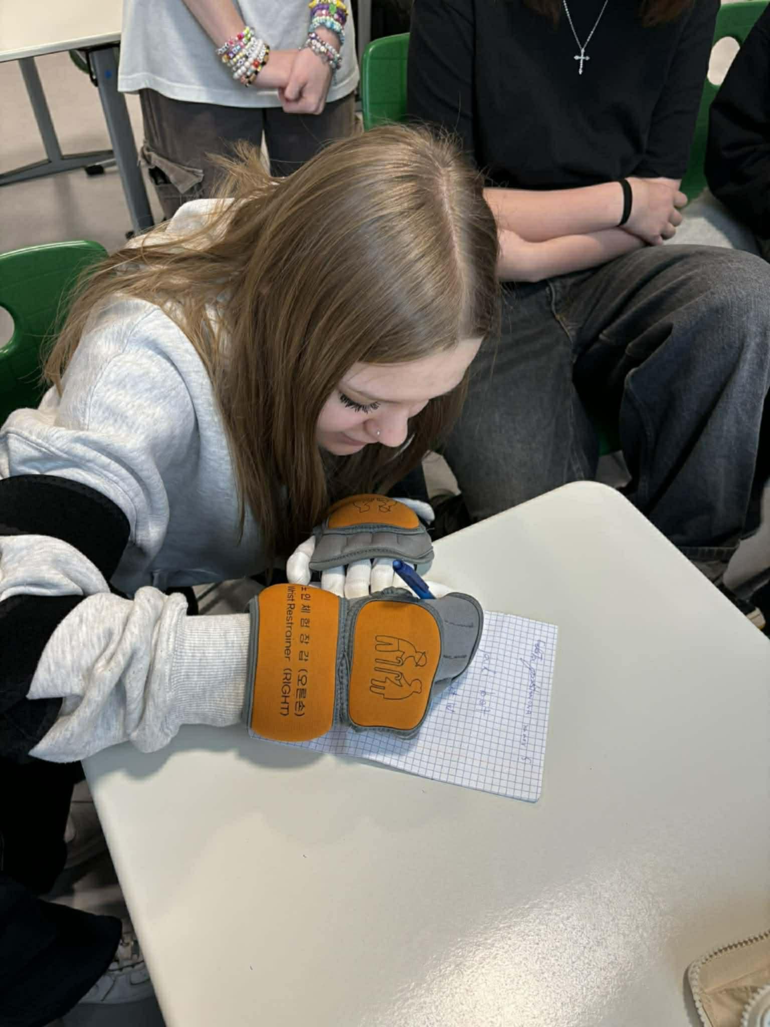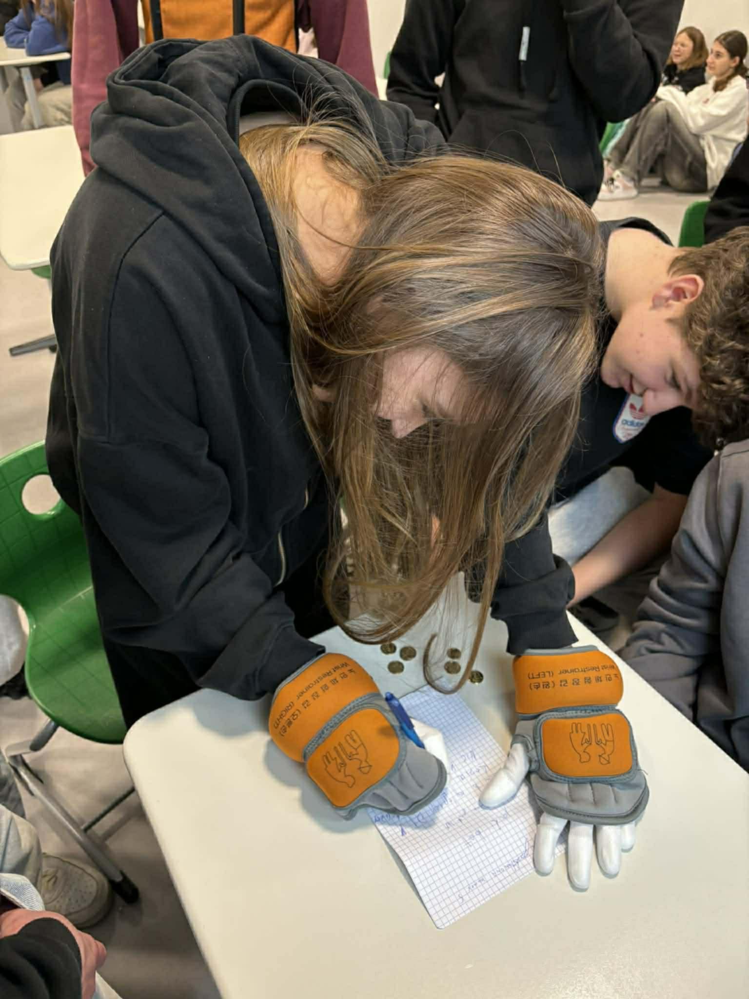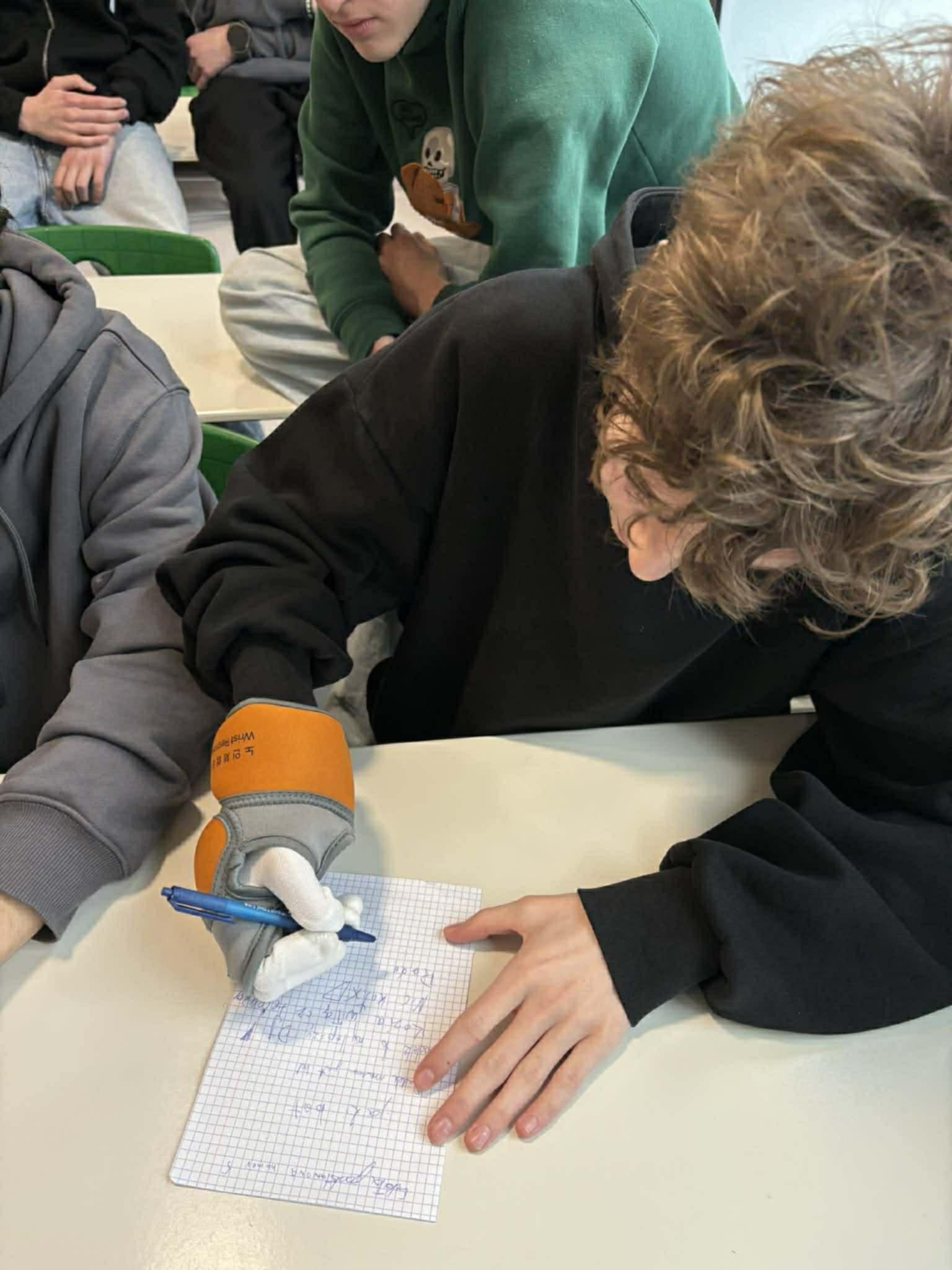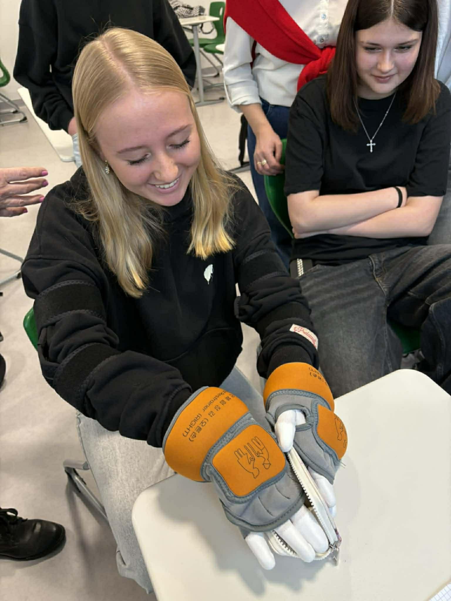 Uczniowie podzielili się na trzy grupy i mierzyli się z wyzwaniami takimi jak: przejść z obciążonymi plecami, brzuchem oraz nogami całą klasę w 10 sekund i usiąść na krześle oraz w całym zestawie podnieść coś z ziemi. Następnym wyzwaniem było wyjęcie w okularach i obciążnikach na nadgarstki z portfelika określoną ilość pieniędzy, napisać list lub nazwę naszej szkoły. Na końcu klasy miały okazje zapytać, jak być tak samo sprawnym jak Pani Zofia .