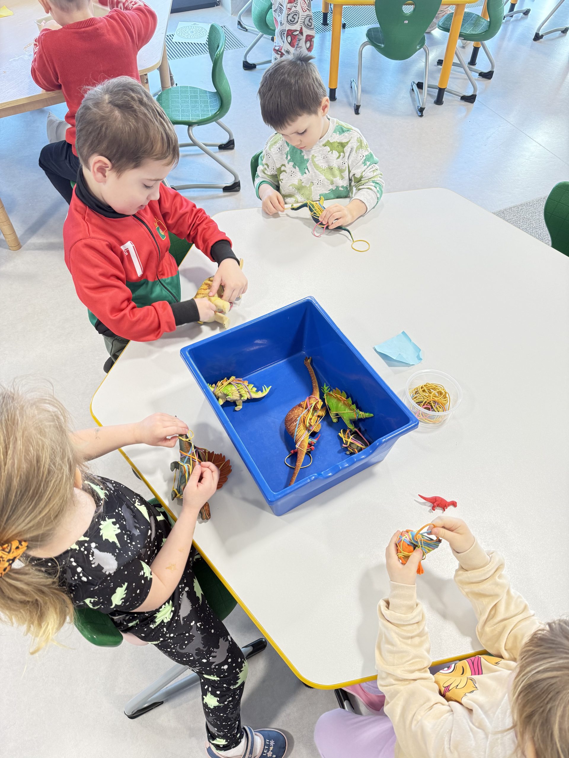 Dinozaury zaplątane w gumkach recepturkach – ćwiczyliśmy małe rączki, uwalniając dinozaury z pułapki.