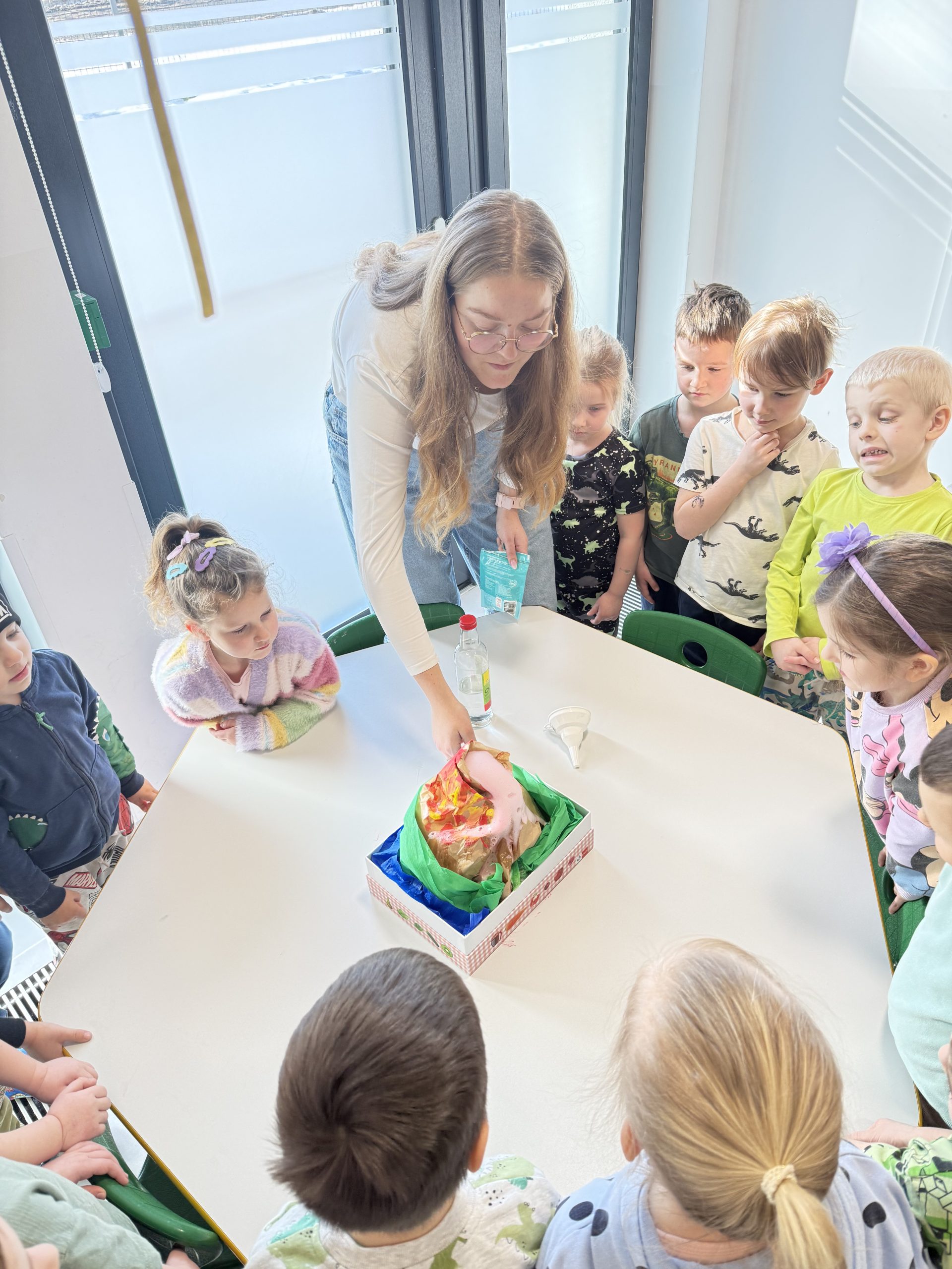 Dzień Dinozaura w naszym przedszkolu był pełen radości, odkryć i świetnej zabawy. Na początku czytaliśmy i oglądaliśmy książki o dinozaurach. Następnie podzieliliśmy dzieci na 5 zespołów. Co 10 minut grupy zmieniały stoliki – jak na prawdziwych stacjach badawczych!