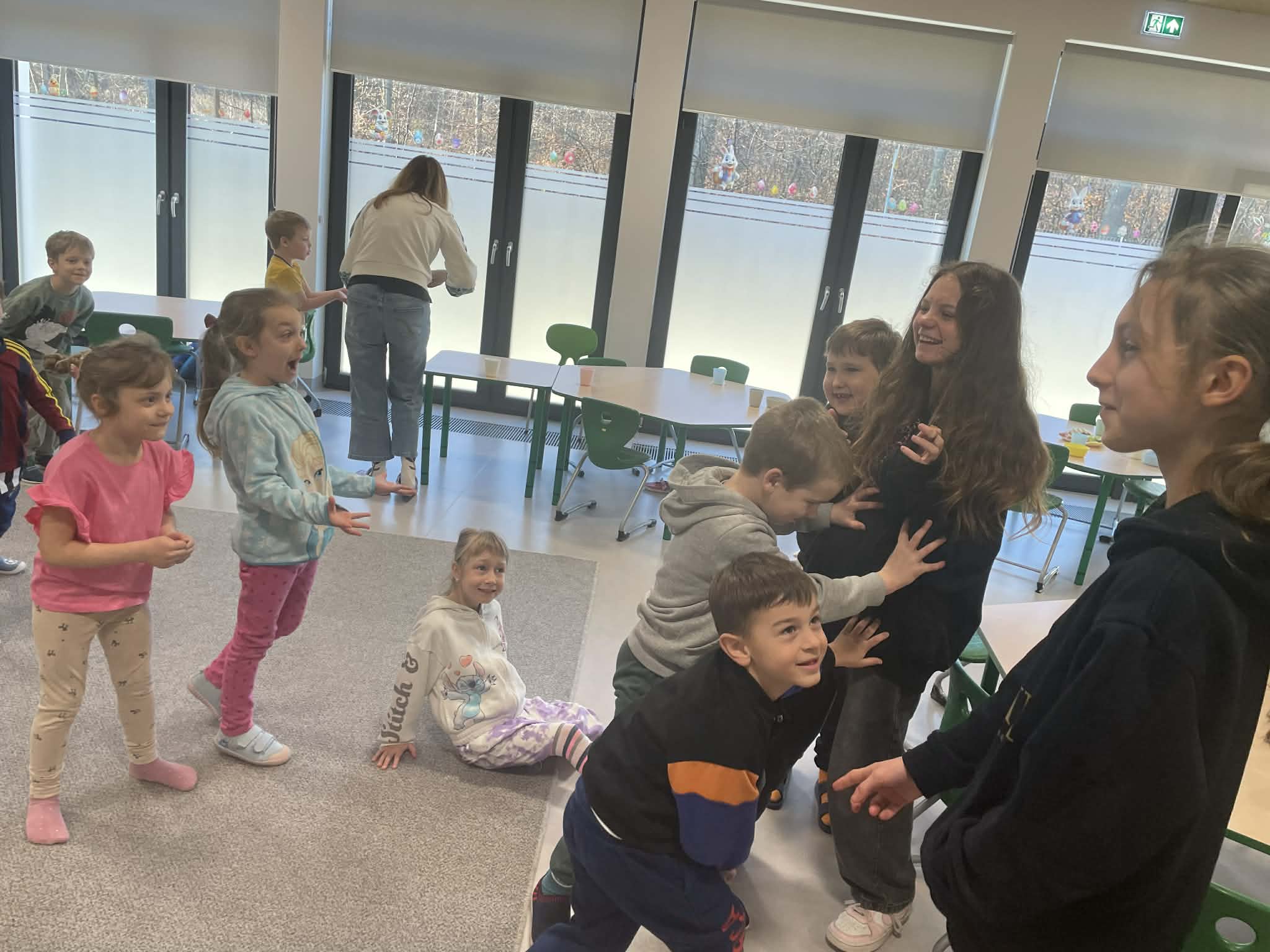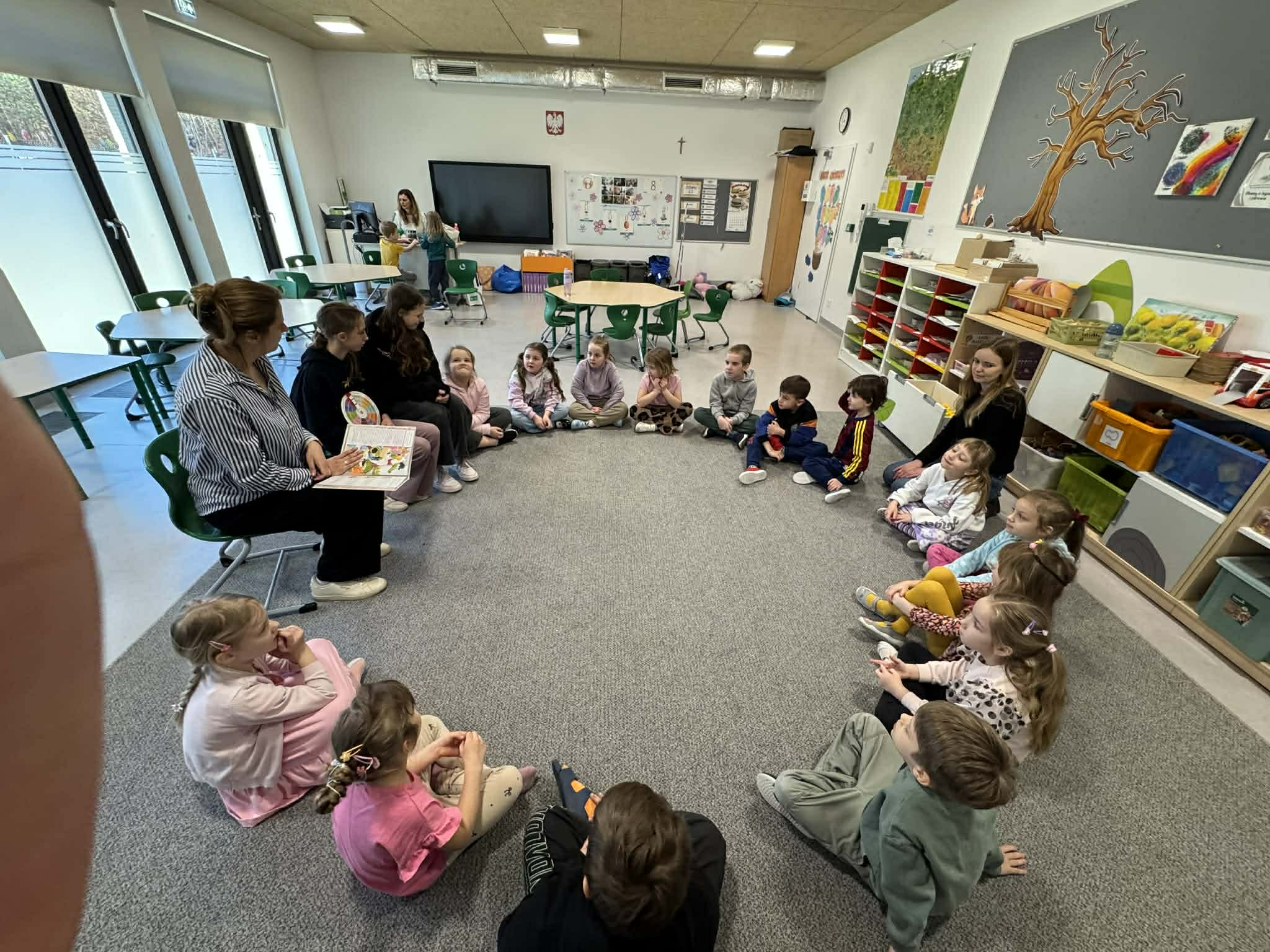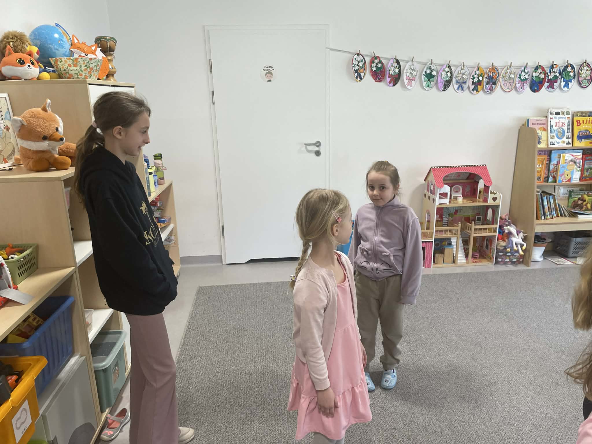 Uczennice klasy 7a – Wiktoria i Anastazja – wspólnie z panią psycholog poprowadziły zajęcia dla dzieci z grupy 0 a poświęcone emocji złości. Spotkanie rozpoczęło się od wysłuchania historii z książki „Uczuciometr Inspektora Krokodyla”, która pomogła dzieciom porozmawiać o tym, czym jest złość i kiedy się pojawia. Następnie dziewczyny pokazały przedszkolakom, jak działa uczuciometr i jak złość może stopniowo narastać.