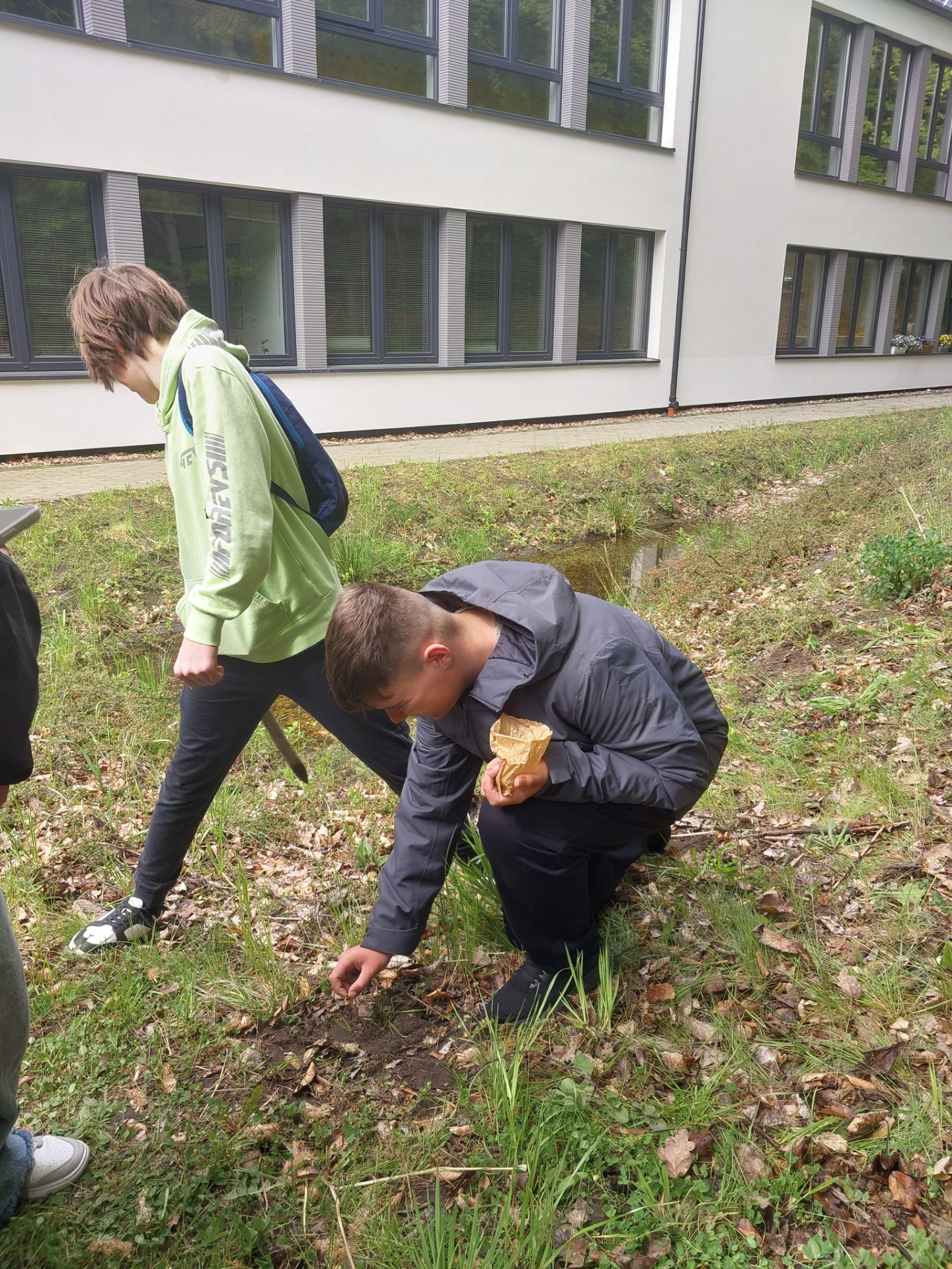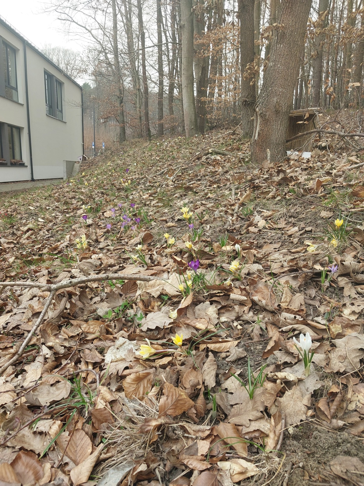 Uczniowie klasy 8B jesienią zasadzili ponad 200 cebulek krokusów na terenach zielonych naszej szkoły. Miało to być symboliczne pożegnanie z podstawówką. A ich wychowawczyni, Pani Ewa, ma się uśmiechać patrząc przez okno wiosną za rok, kiedy ich już nie będzie. Krokusy zakwitły.