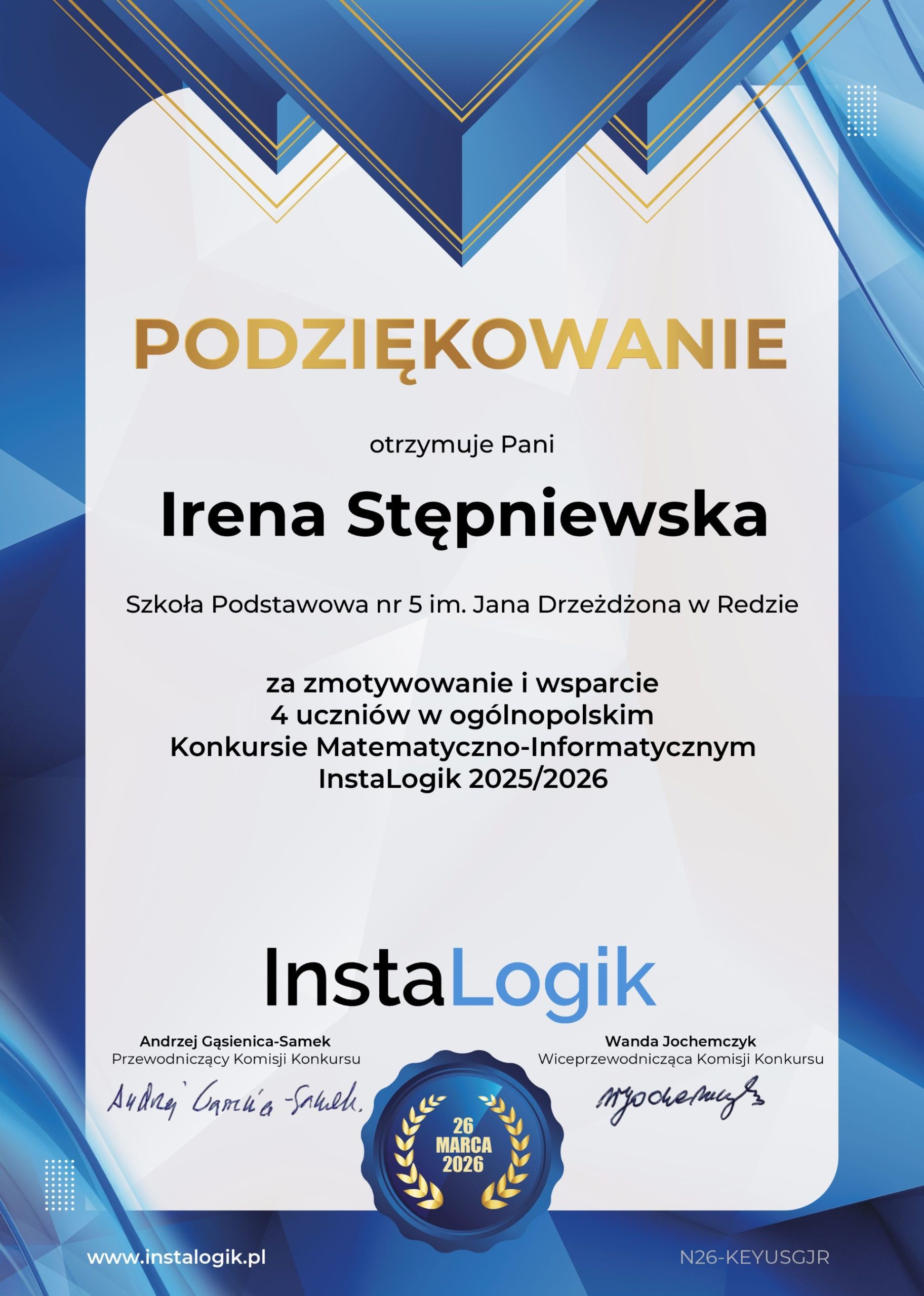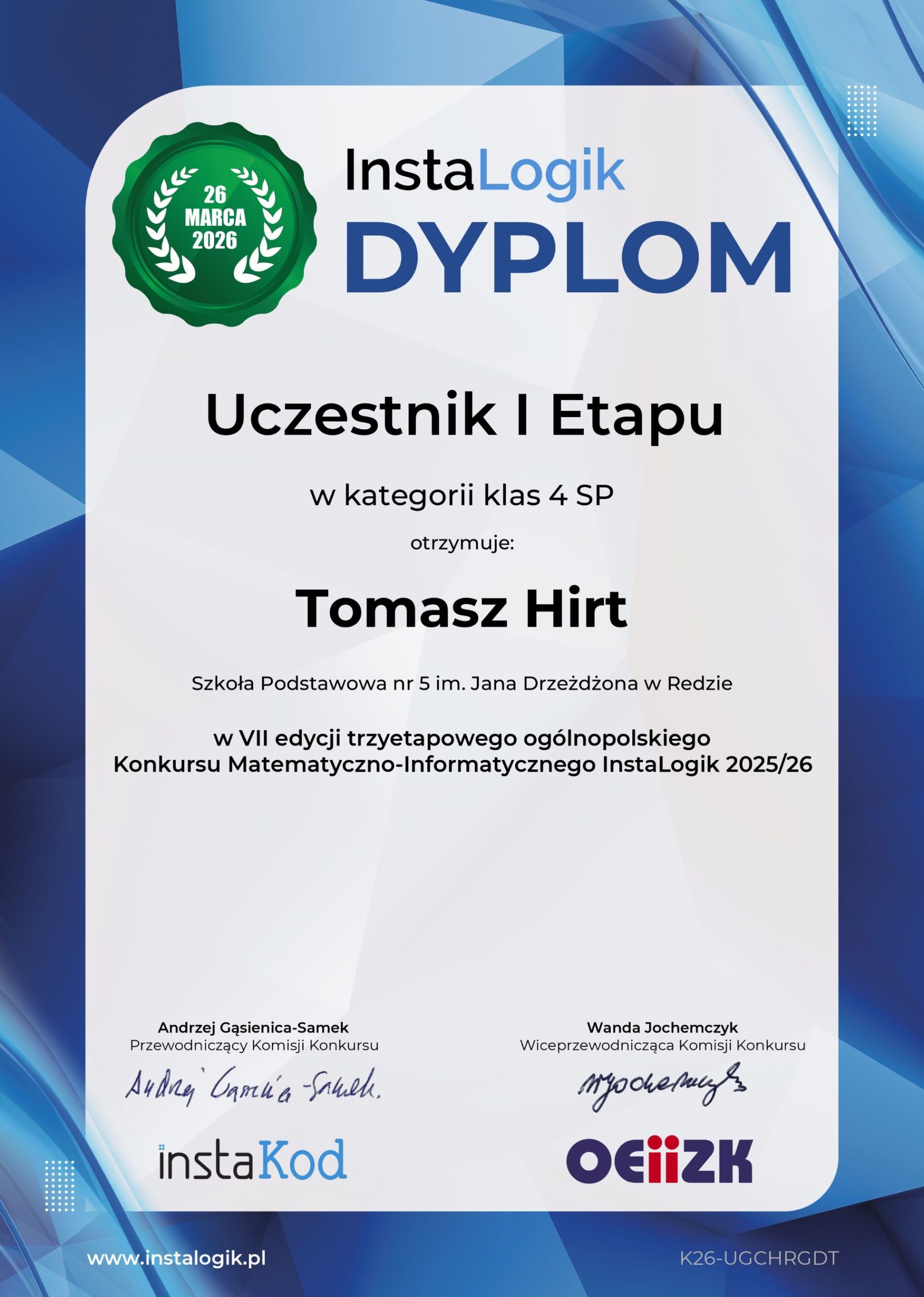 Z wielką radością informuję, że Nataniel Pikul, uczeń kl. 7b w naszej szkoły, został Laureatem I miejsca w VII edycji ogólnopolskiego konkursu matematyczno-informatycznym InstaLogik, organizowanego przez @InstaKod. To ogromne osiągnięcie jest efektem ich systematycznej pracy, zaangażowania i pasji do nauki.