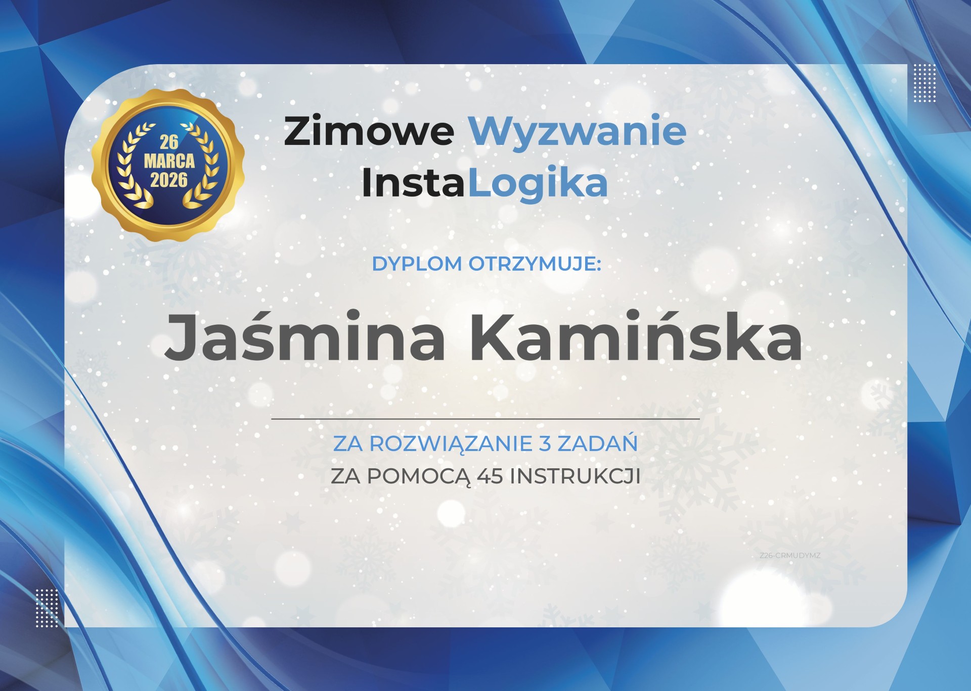 – Jaśminie Kamińskiej z kl. 4a,  która jako uczestnik II etapu , w kategorii klas 4 zajęła drugi wynik w mieście Reda oraz wzięła udział w dodatkowym zimowym wyzwaniu