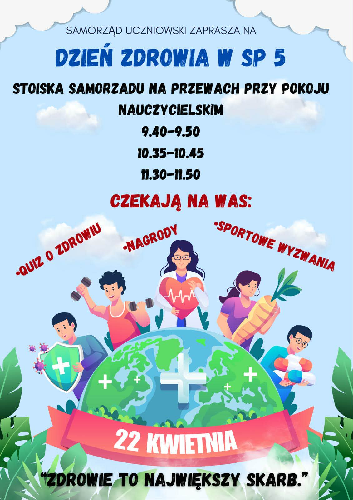 Samorząd Uczniowski serdecznie zaprasza uczniów i nauczycieli do udziału w Dniu Zdrowia, który odbędzie się 22 kwietnia w naszej szkole. W tym dniu na przerwach przy pokoju nauczycielskim będą dostępne specjalne stoiska przygotowane przez Samorząd Uczniowski.