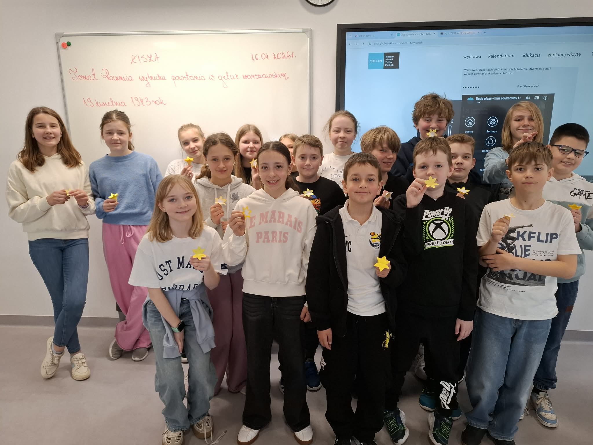 W czwartek uczniowie klas V na zajęciach języka polskiego wzięli udział w Akcji Żonkil – ogólnopolskiej akcji organizowanej przez Muzeum POLIN Historii Żydów Polskich. Zajęcia miały na celu przybliżyć uczniom historię getta w Warszawie, ponadto omówiliśmy przyczyny wybuchu powstania w getcie, rocznica którego przypada 19 kwietnia.