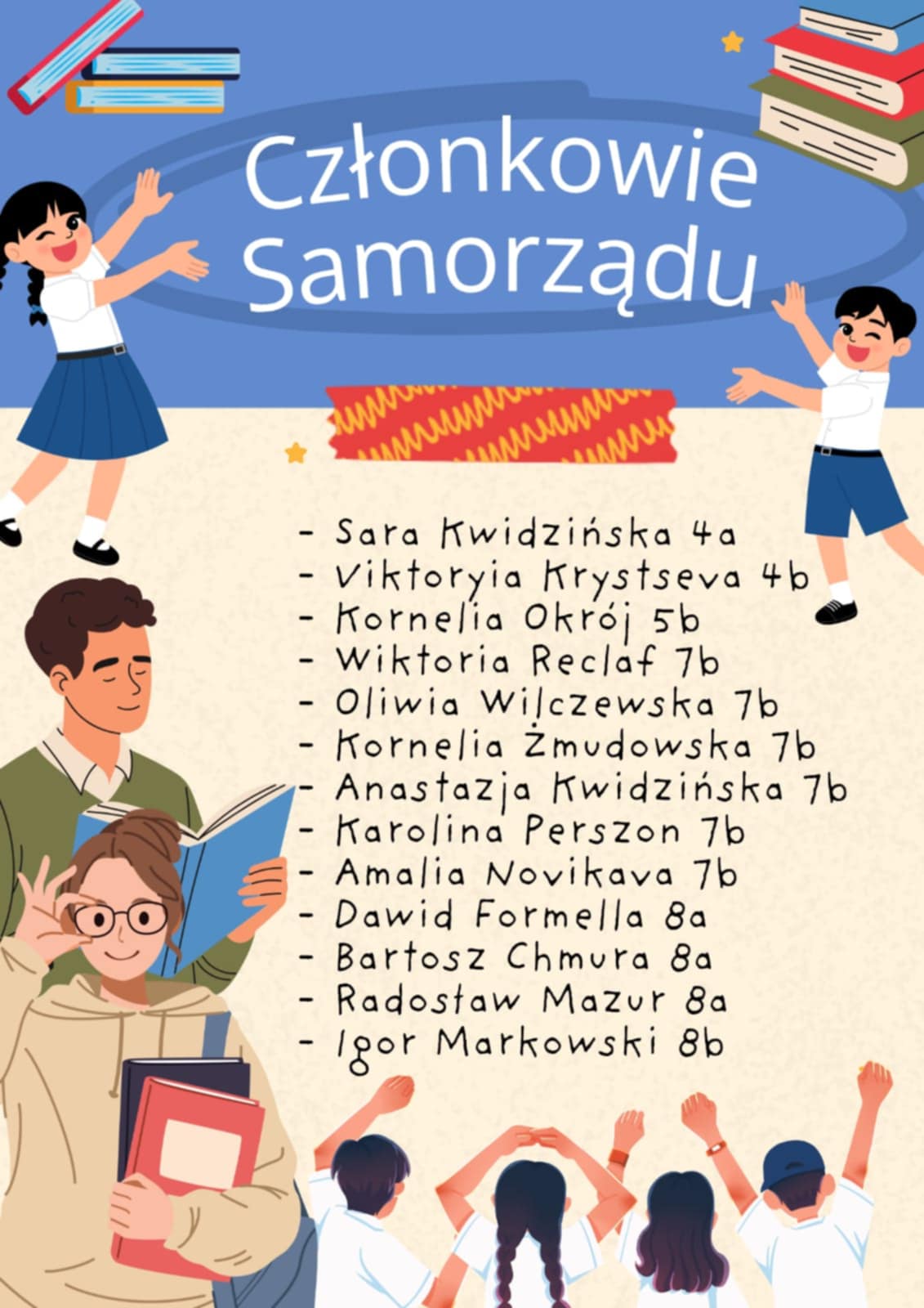 Samorząd Uczniowski w roku szkolnym 2025/2026 Serdecznie gratulujemy i dziękujemy wszystkim kandydatom za udział! Działalność Samorządu Uczniowskiego w tym roku szkolnym wspierać będą : Magdalena Gurzęda, Anna Chojnacka i Natalia Dampc